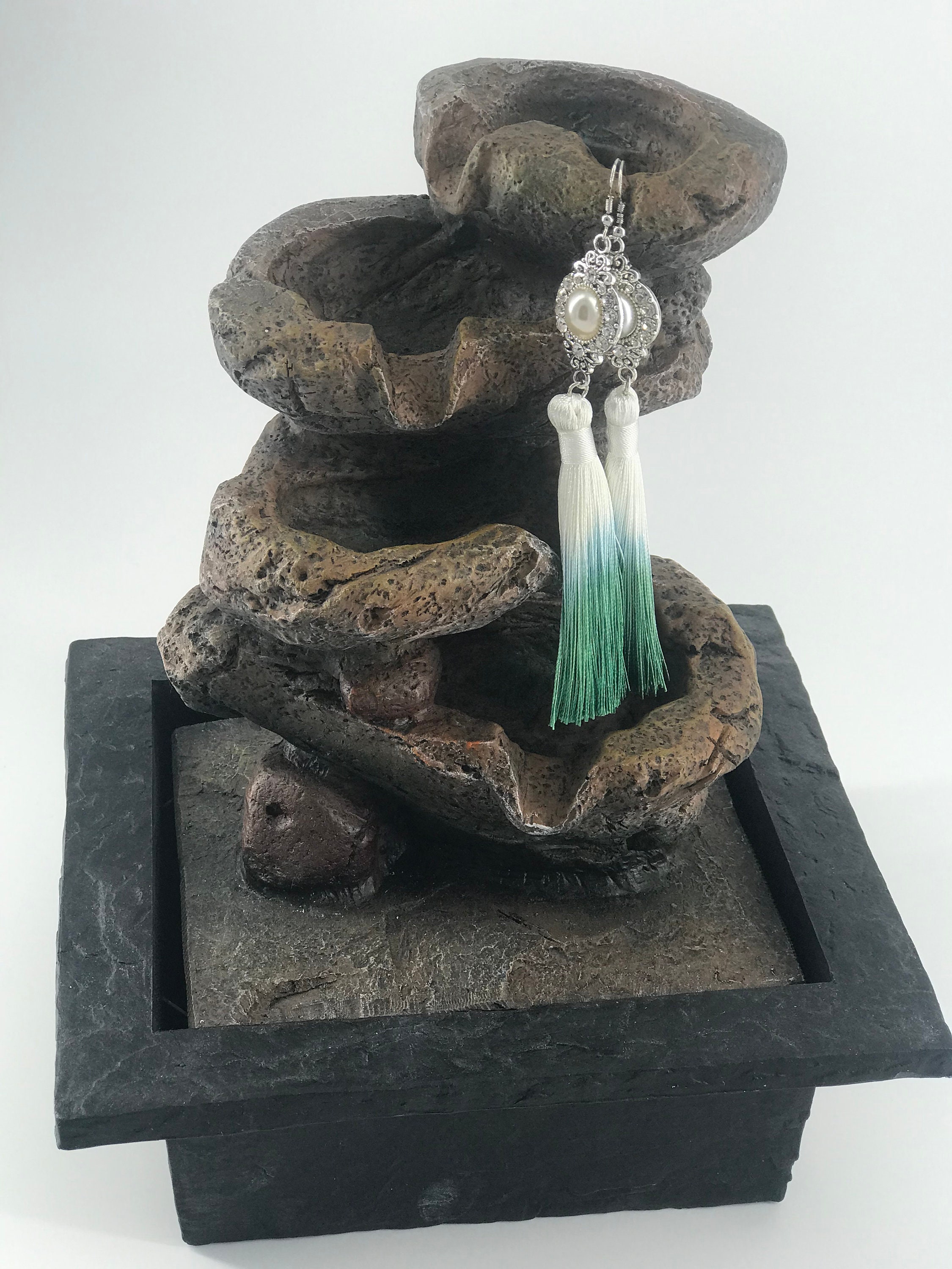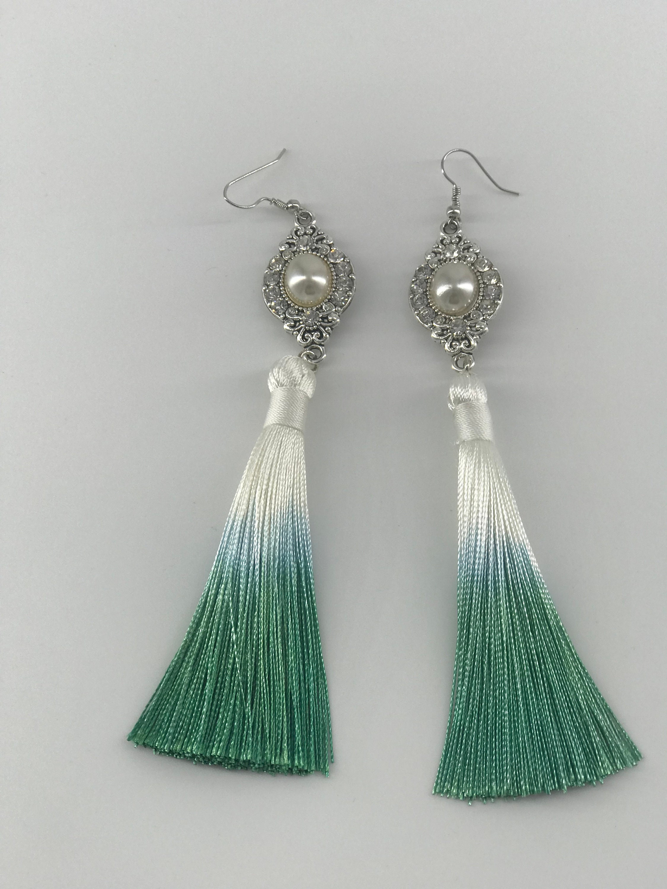 Antiqued dark silver plated earrings, with a white pearls, blue and green thread, between teal and light light green,