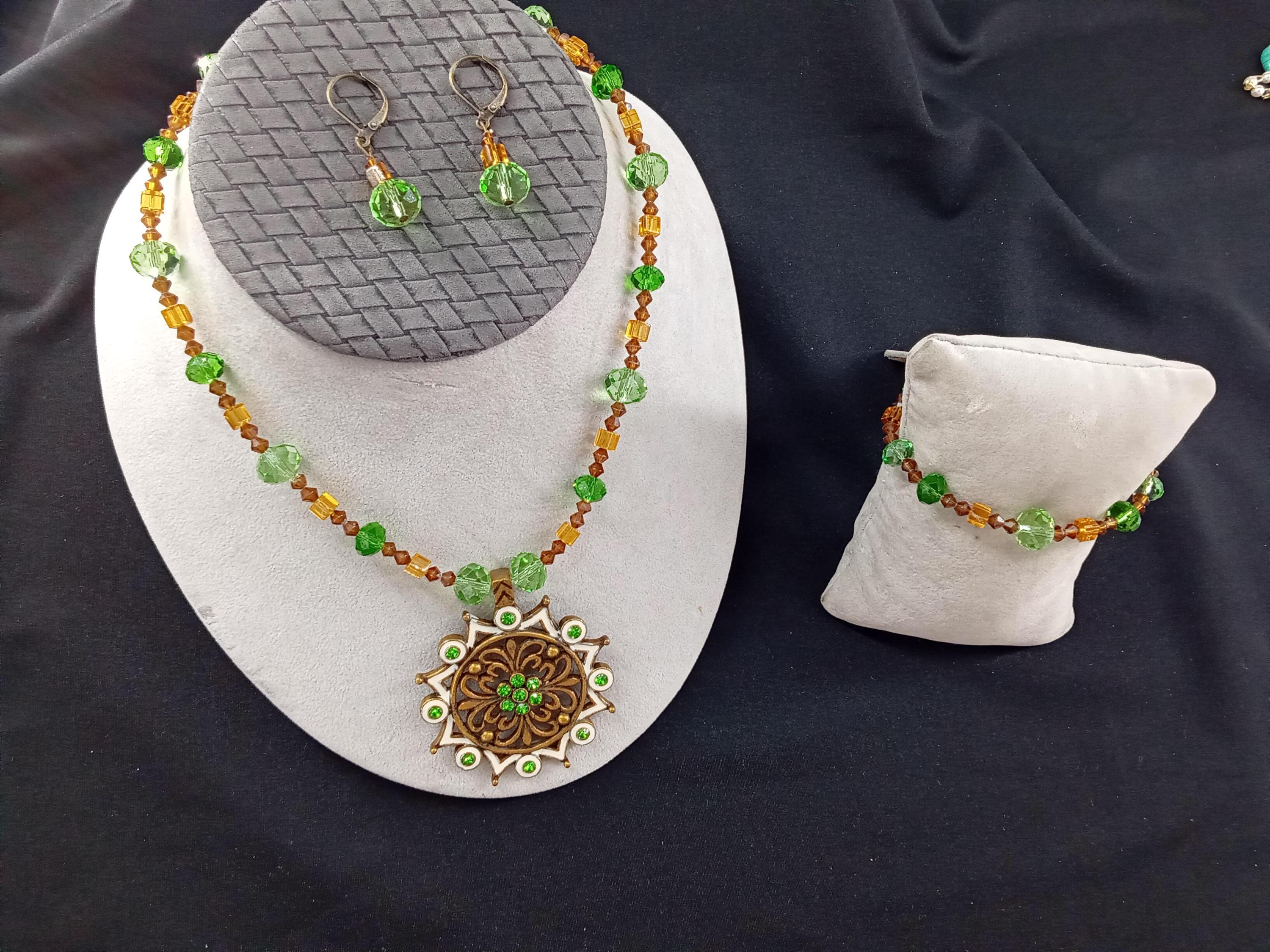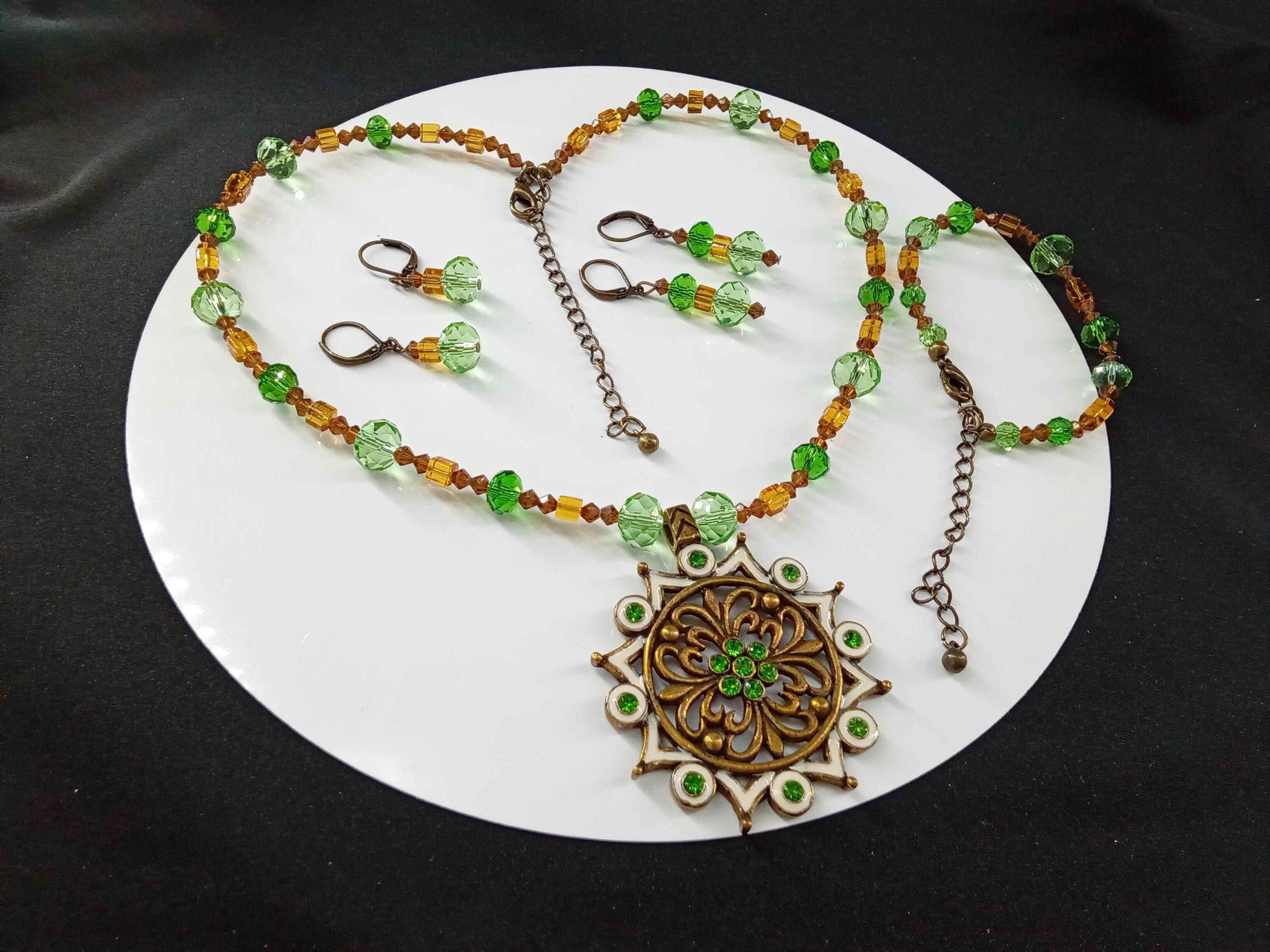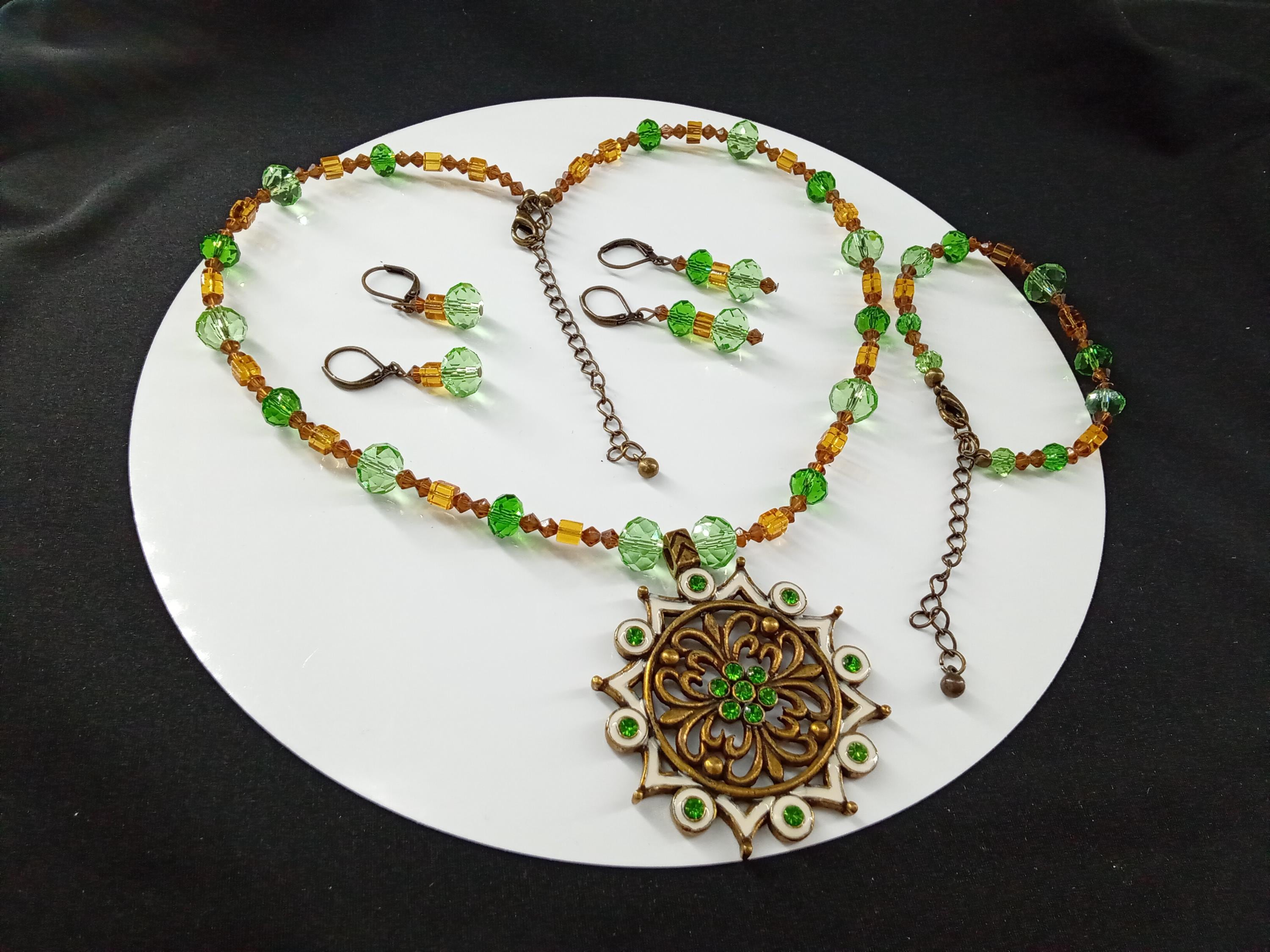 The green set and light brown color is made it with glass and acrylic beads, include one necklace, one bracelet and one pair of earrings, The size of the beads are from 4 mm to 12 mm and the metal is dark antiqued gold plated, The size of the pendant is approximately 2 inches, looks really pretty. The length of the necklace is 18 inches and 3 extra adjustable chain, The bracelet is 6 and half inches including the clasp and 3 extra adjustable chain, the long earrings are around 1 and half inches including the ear wire, the short earrings are around 1 inch including the ear wire If you want a different size on the necklace bracelet or earrings or stretch bracelet please contact me, " Normal response time is between 12-24 hours " Usually you receive the order between 5-7 business days through USPS first class.