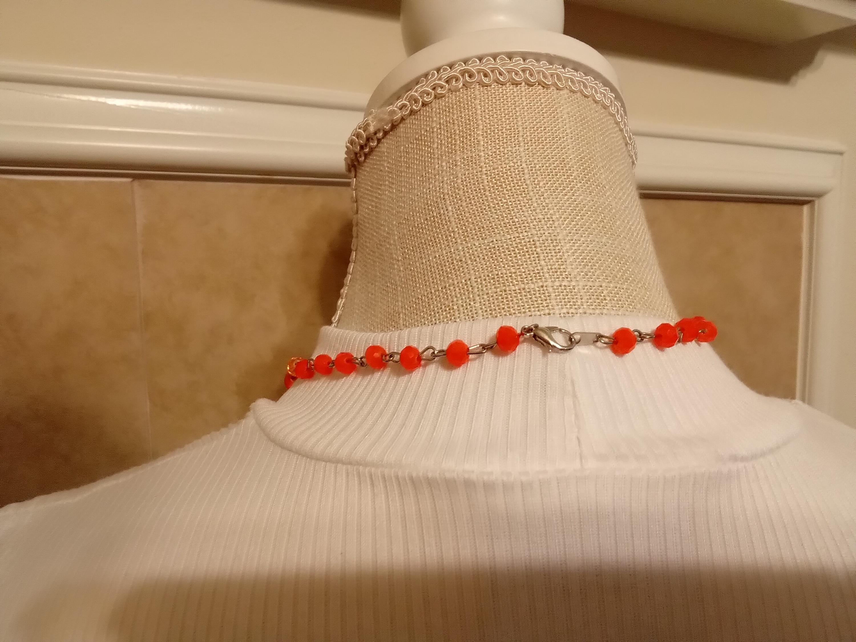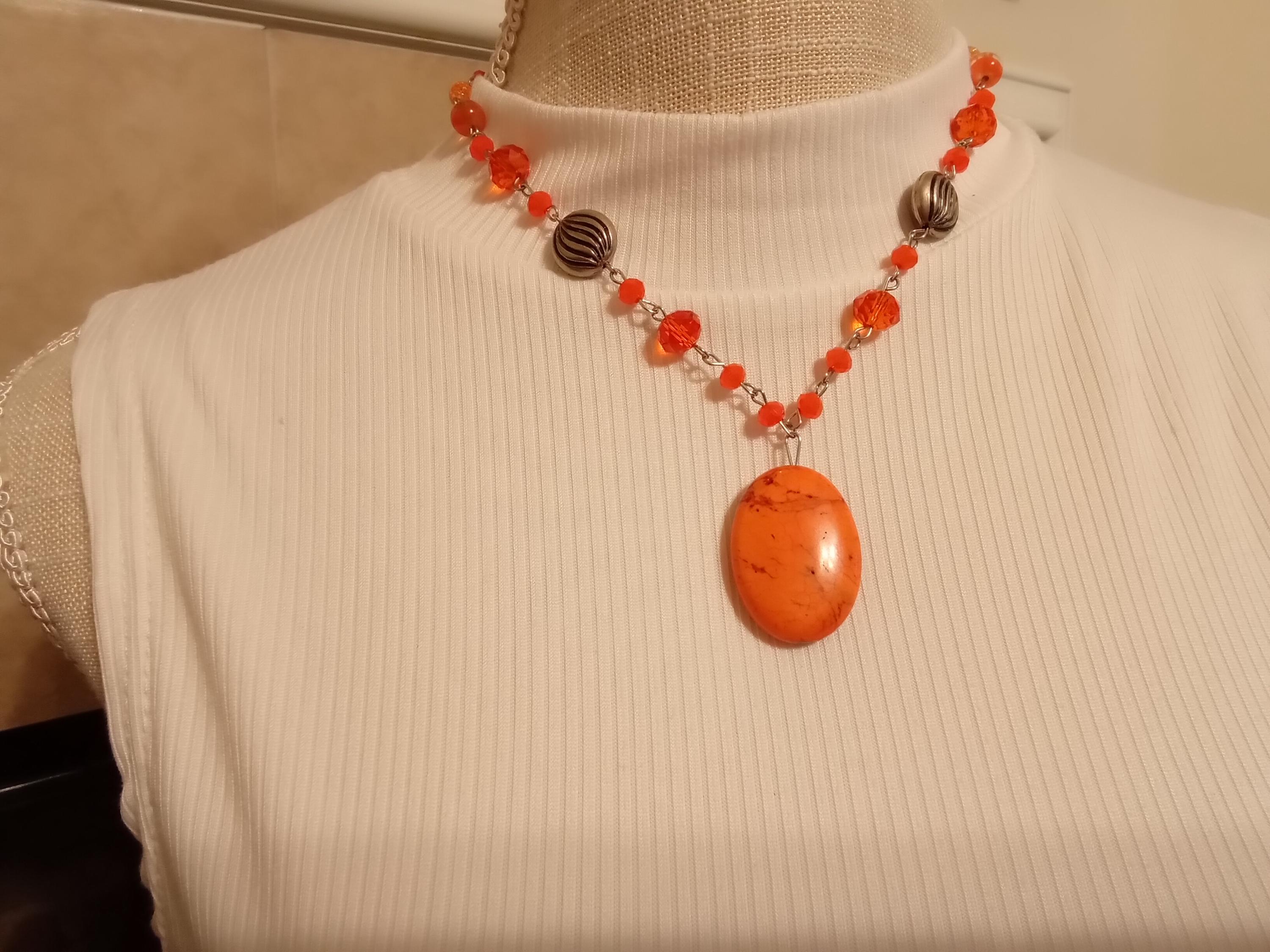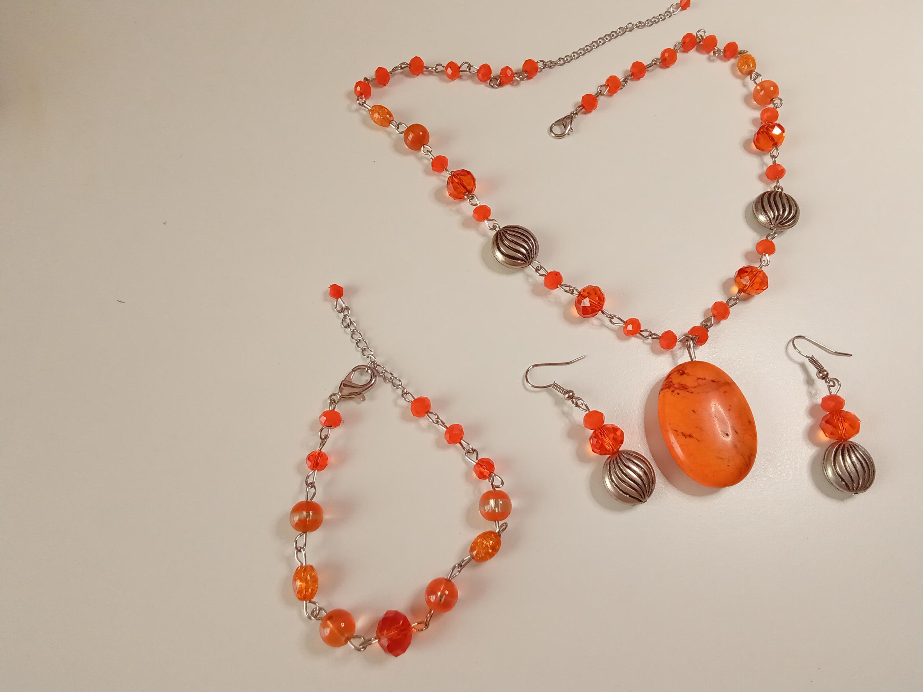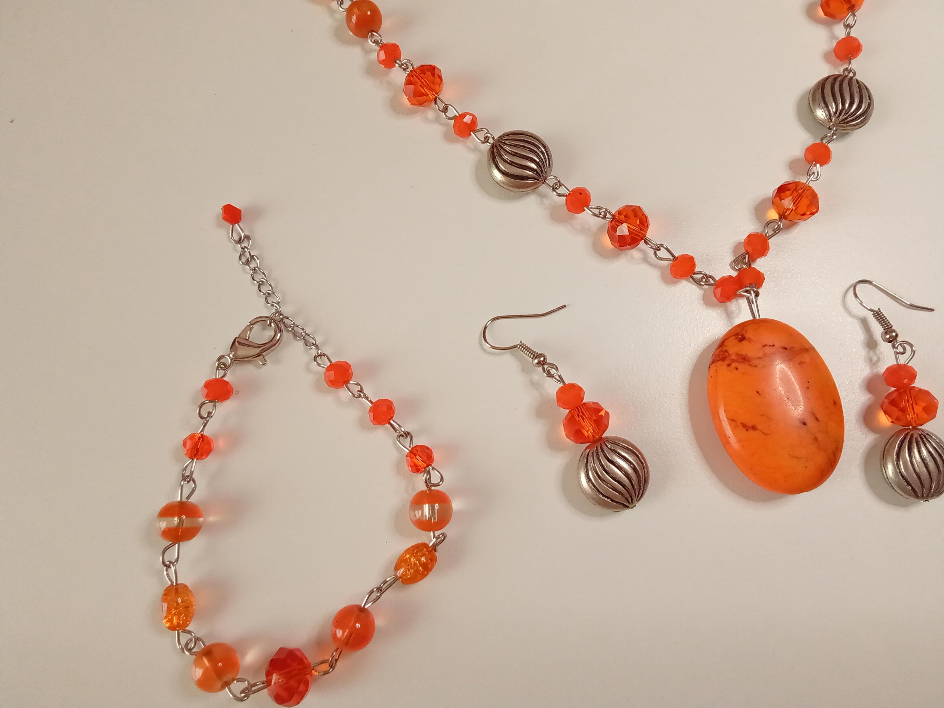 A beautiful orange set, Necklace bracelet and earrings with glass beads 6mm 8mm 6x10 12mm, the pendant necklace is stone and is about 20mm wide x30mm high, [ Is 1 and half inch with the wire pendant,