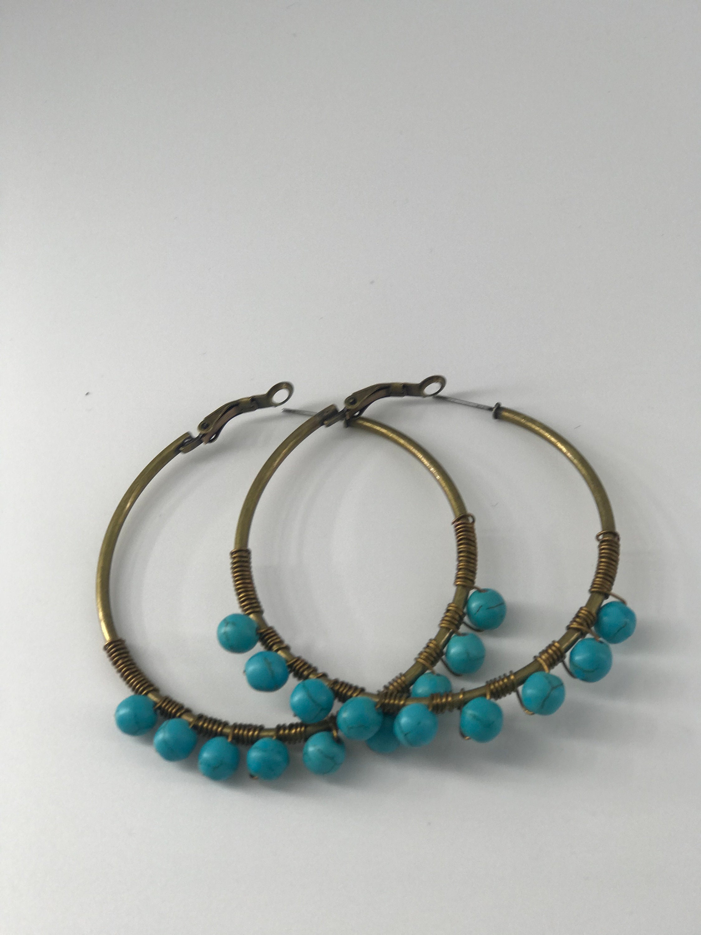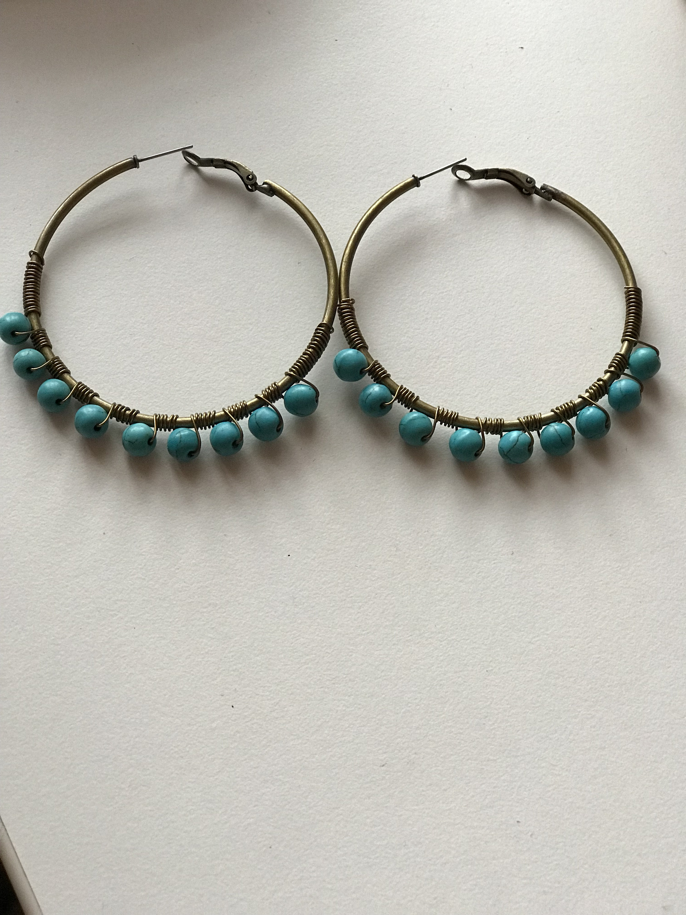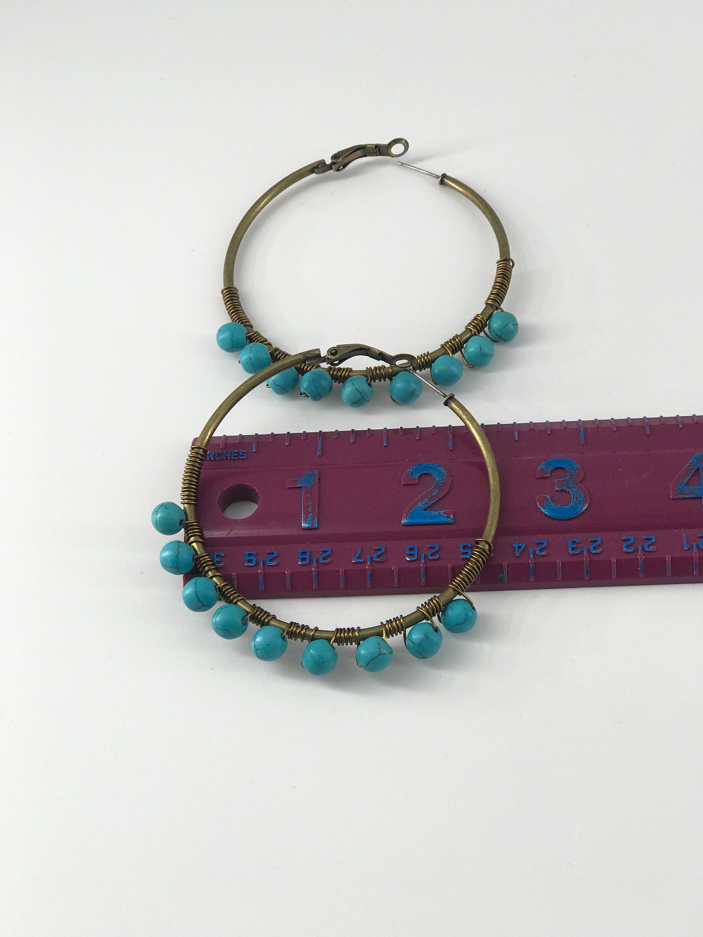 Beautiful casual and elegant earrings,it is bronze color with imitation turquoise beads, beads size are 6mm size and the hoop is 2 and half inches,If you want other color or something else to match the earrings please send me a message, Normal response time is between 12-24 hours, The handling and shipping are free, I will send you the order next after you make the order. so you will receive the order between 5-7 business days through USPS first class.