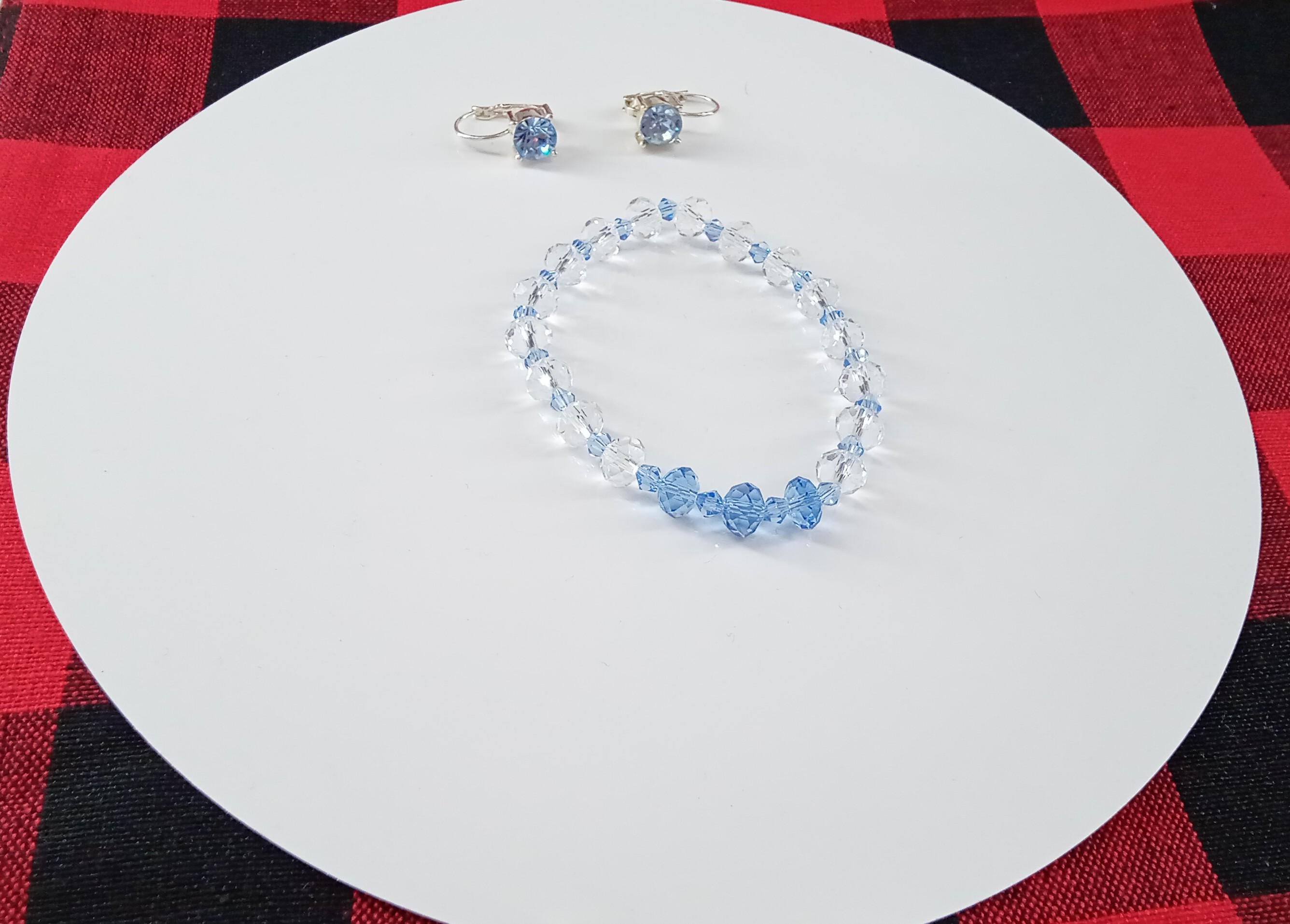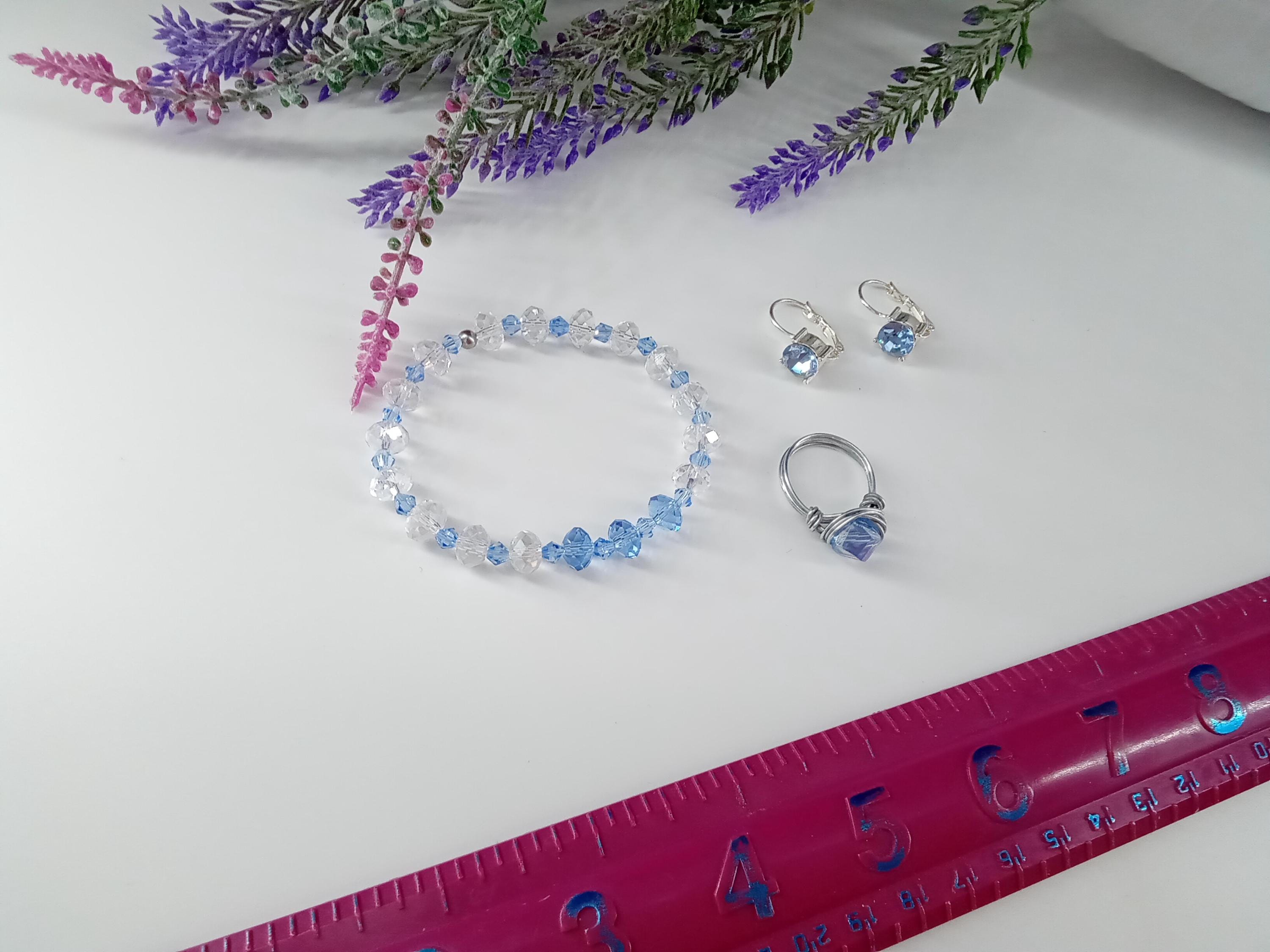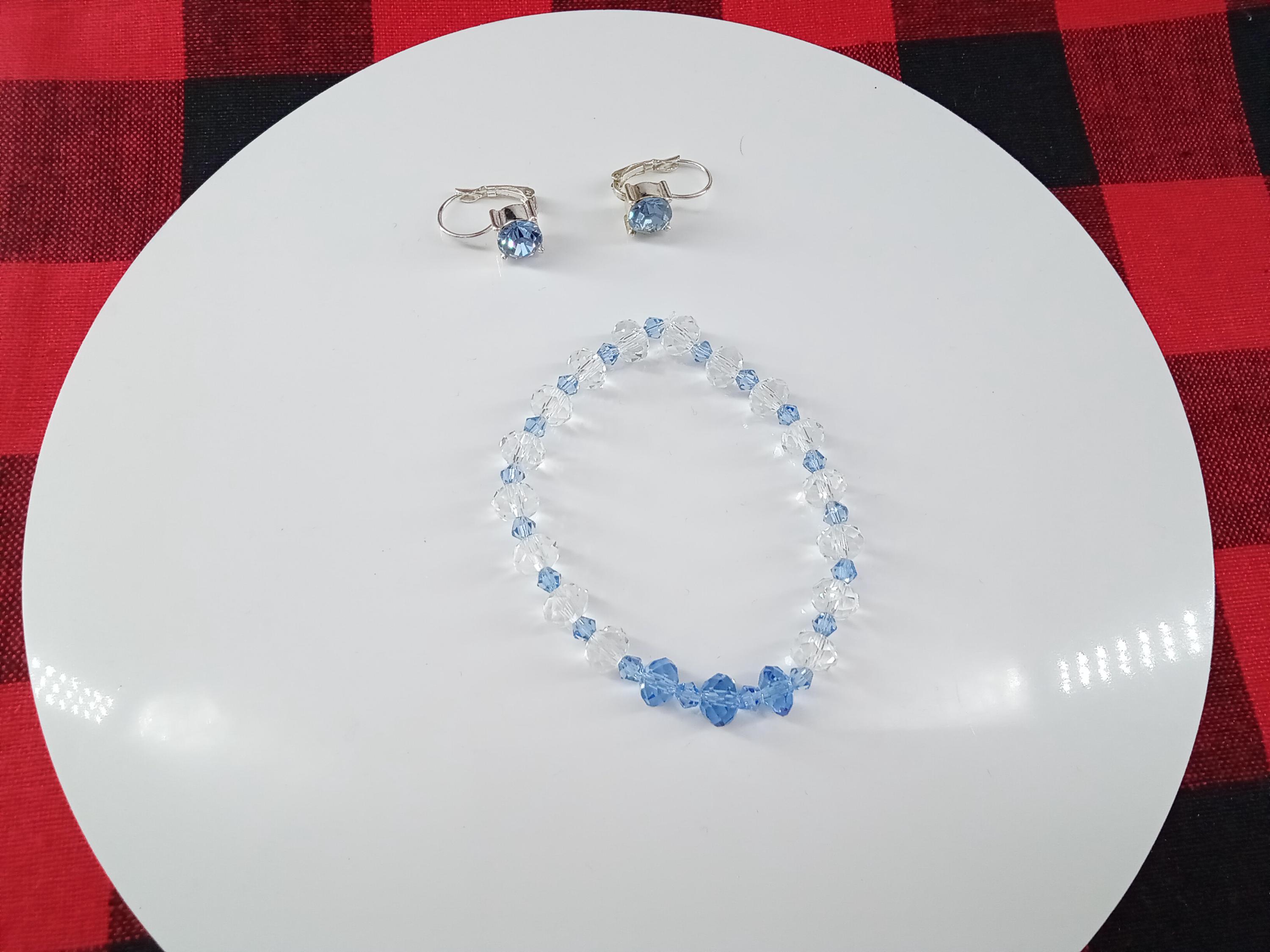 Beautiful fashion earrings set, the earrings are like 3/4 of inch, almost 1 inch including the ear wire, it is casual and elegant, you can wear them to the work, to the church, everywhere, is silver plated and the blue glass color is around 10 mm size, with this order You will receive a free blue stretch bracelet to match the blue earrings, the free ring comes in different sizes Usually you receive the order between 5-7 business days through USPS first class,