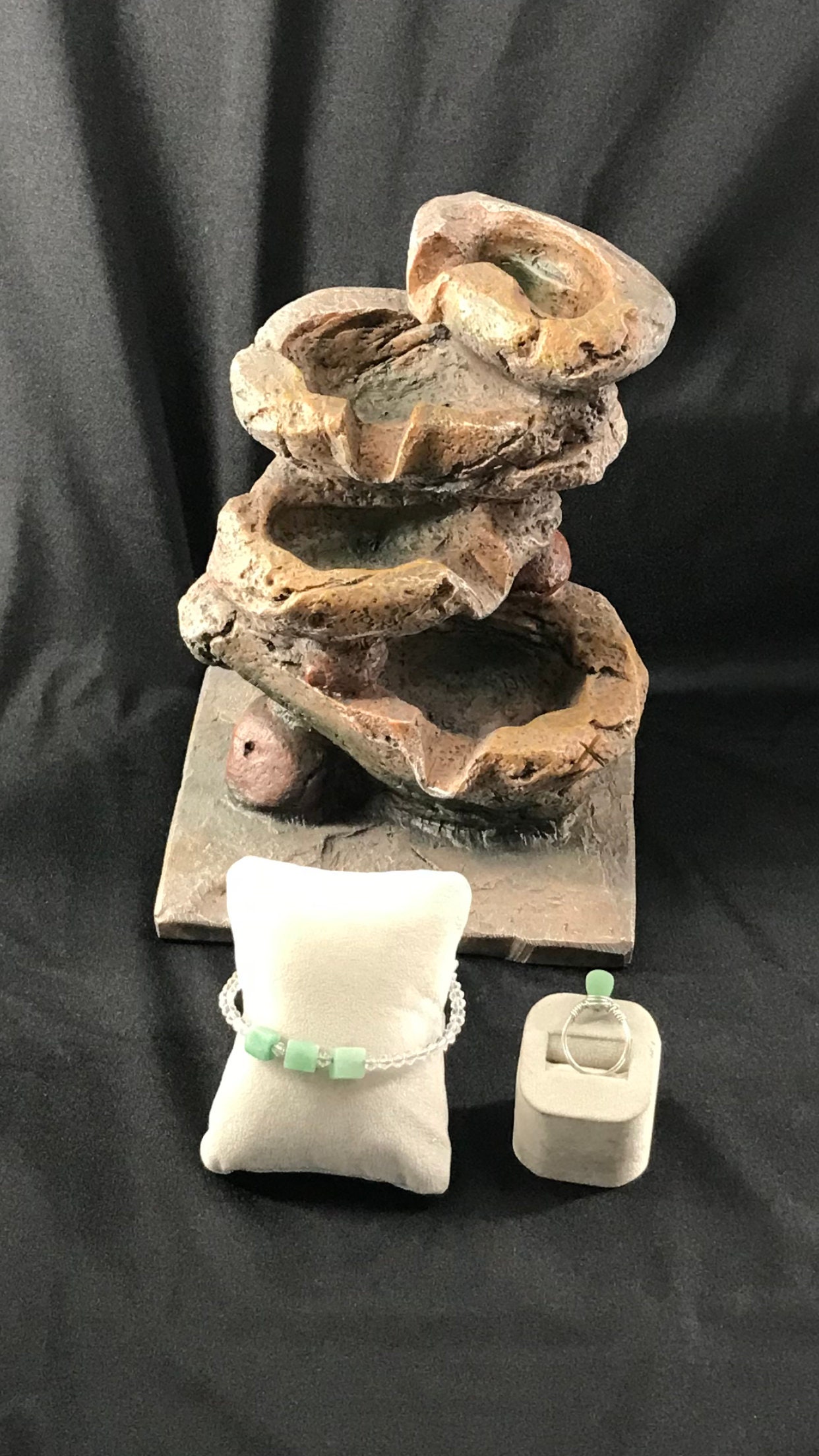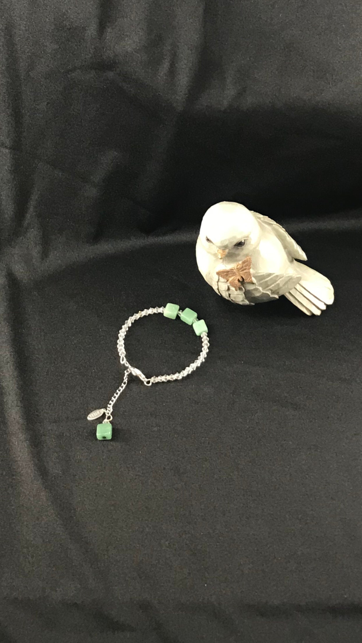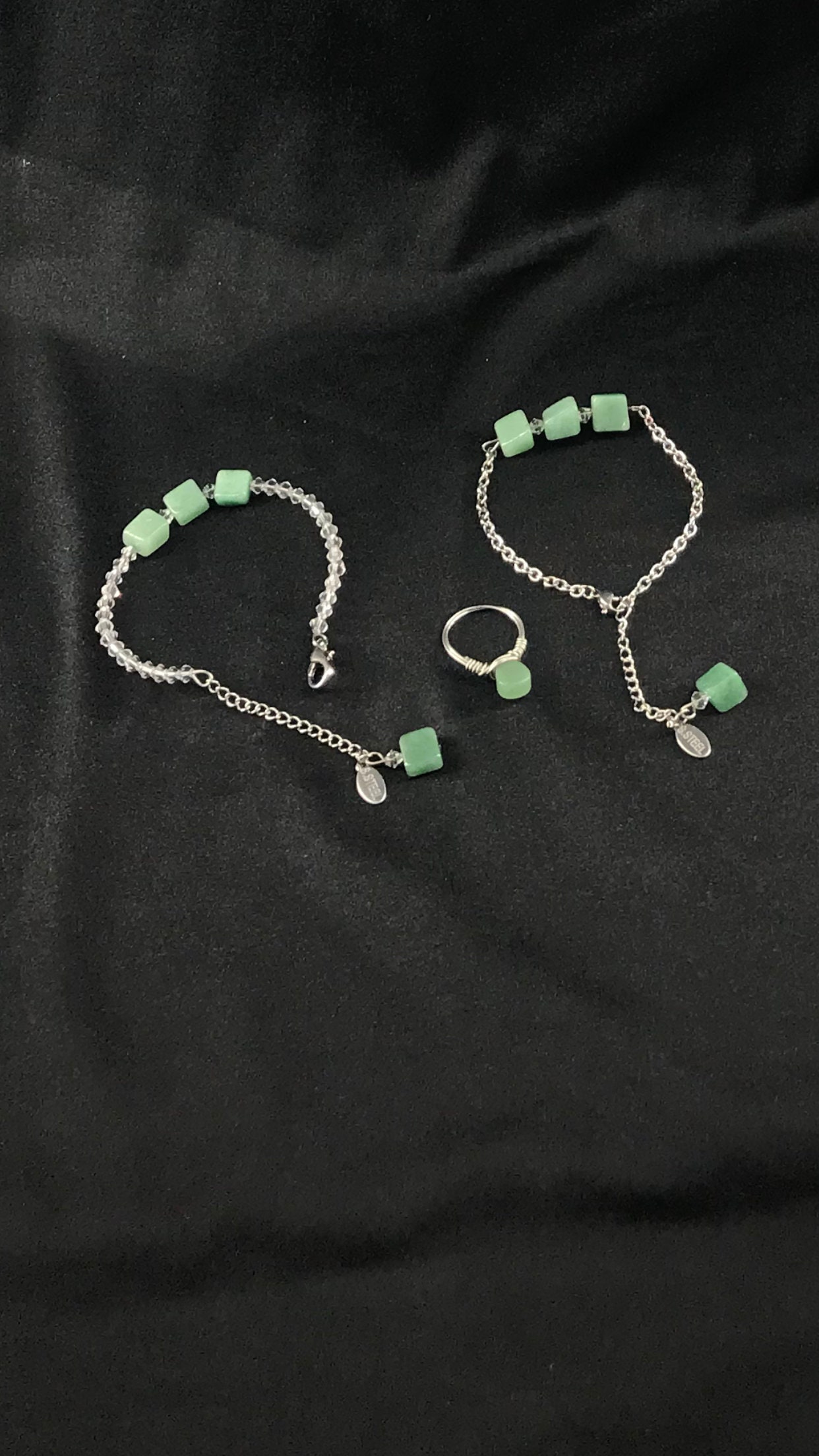 Beautiful bracelet with aventurine stone, It a perfect gift for you or for someone special, If you want a bigger size, Just contact me please, it is said that the aventurine stone is for finding a job or something special and for good luck in job interviews " Normal response time is between 12-24 hours " The bracelets are Sterling silver, Stainless steel and the bangle is made with clear crystal and stainless steel wire, [ The Sterling silver bracelet is not on the picture yet } The stone on the bracelets are around 8-12mm size, ring is not included, Please contact me If you want the earrings or the necklace to match the bracelet and ring, Usually you will receive the order between 5-7 business days through USPS first class.