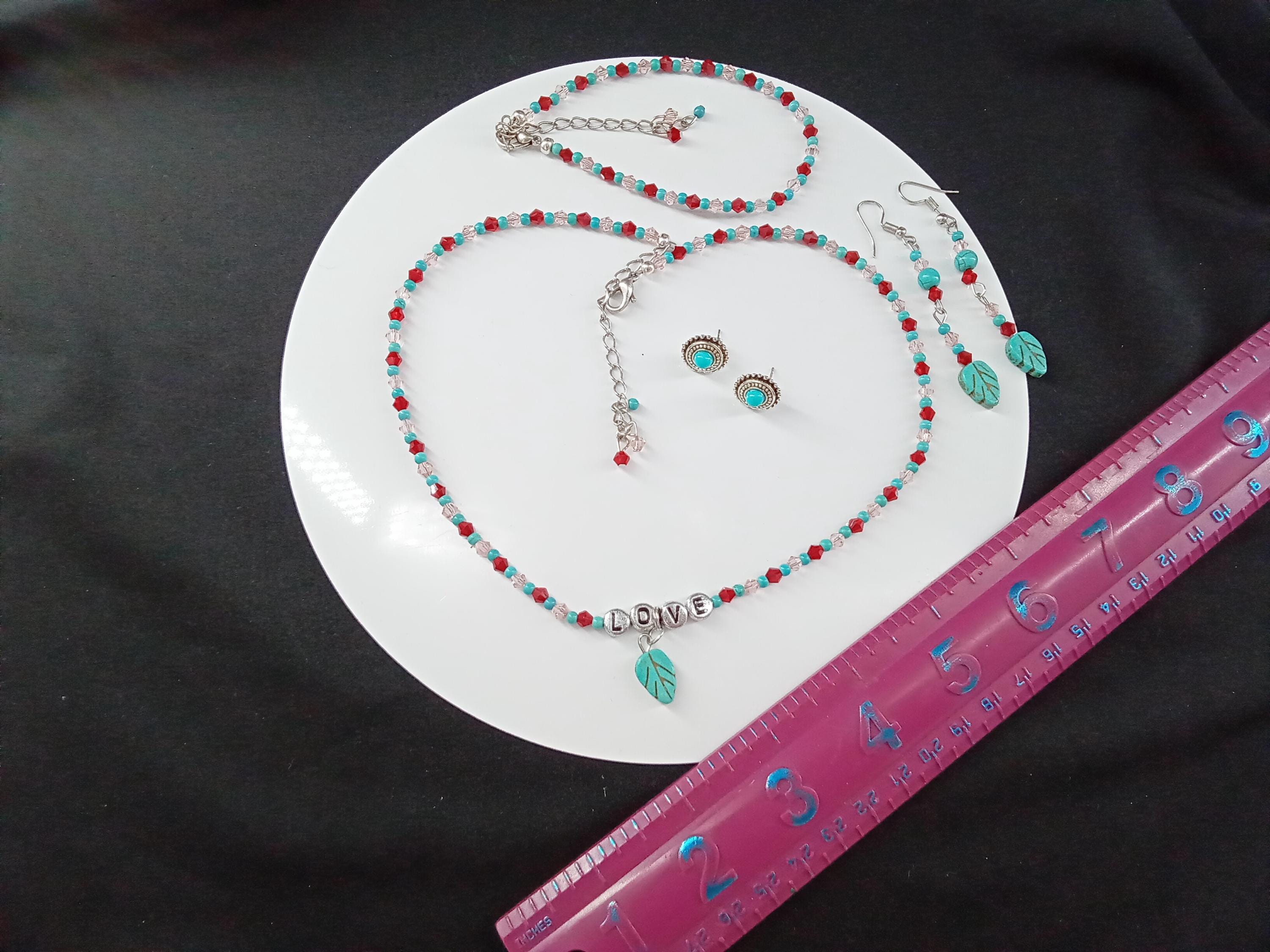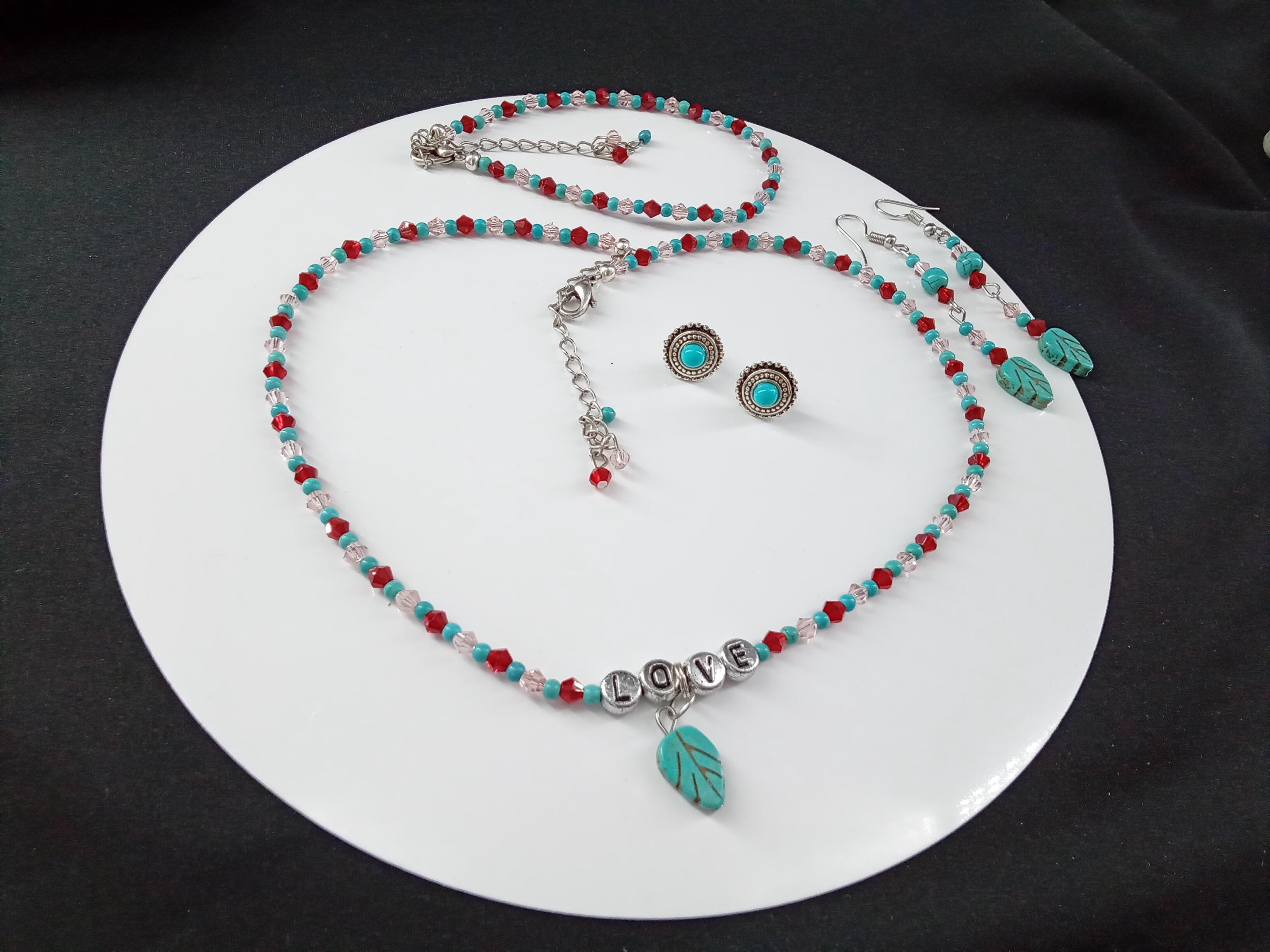 Beautiful set of jewelry, You can use it in different occasions, church, valentine day, Christmas day, parties, and more, they are a casual jewelry, a necklace a bracelet and a pairs of earrings, the free earrings are the long earrings colors: turquoise color 3mm size, dark red and pink bicone beads 3x4 mm size, the metal is silver plated, the size necklace is around 16 inches and 3 inches chain with lobster clasp, The bracelet size is stretch 6 inches and 7 {choose a size } the long of the earrings are almost 3 inches including the ear wire, the small earrings are hypoallergenic If you want other color or other size,and anklet or something else, please contact me, Usually respond time is between 12-24 hours, Usually you receive the order between 5 to 7 business days after you place the order.