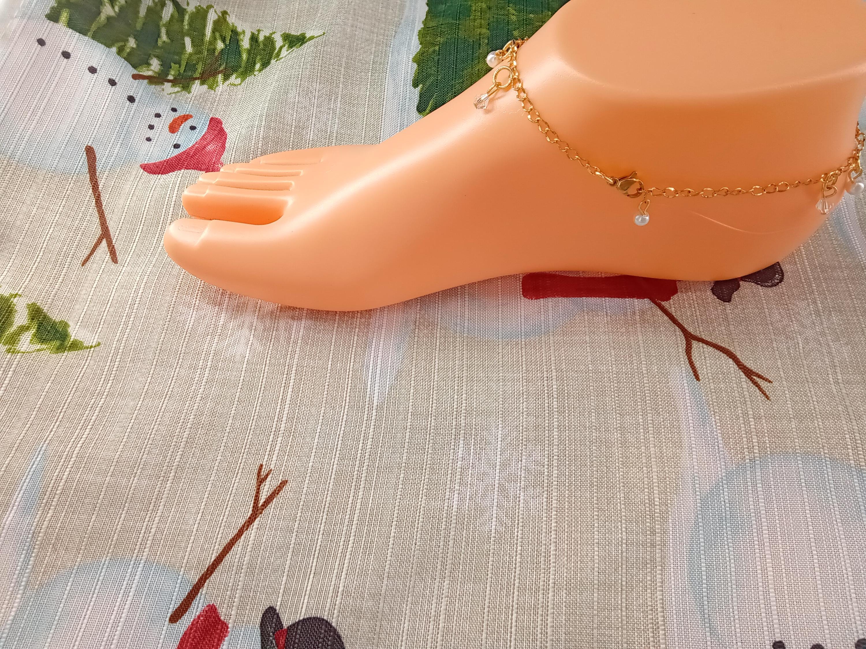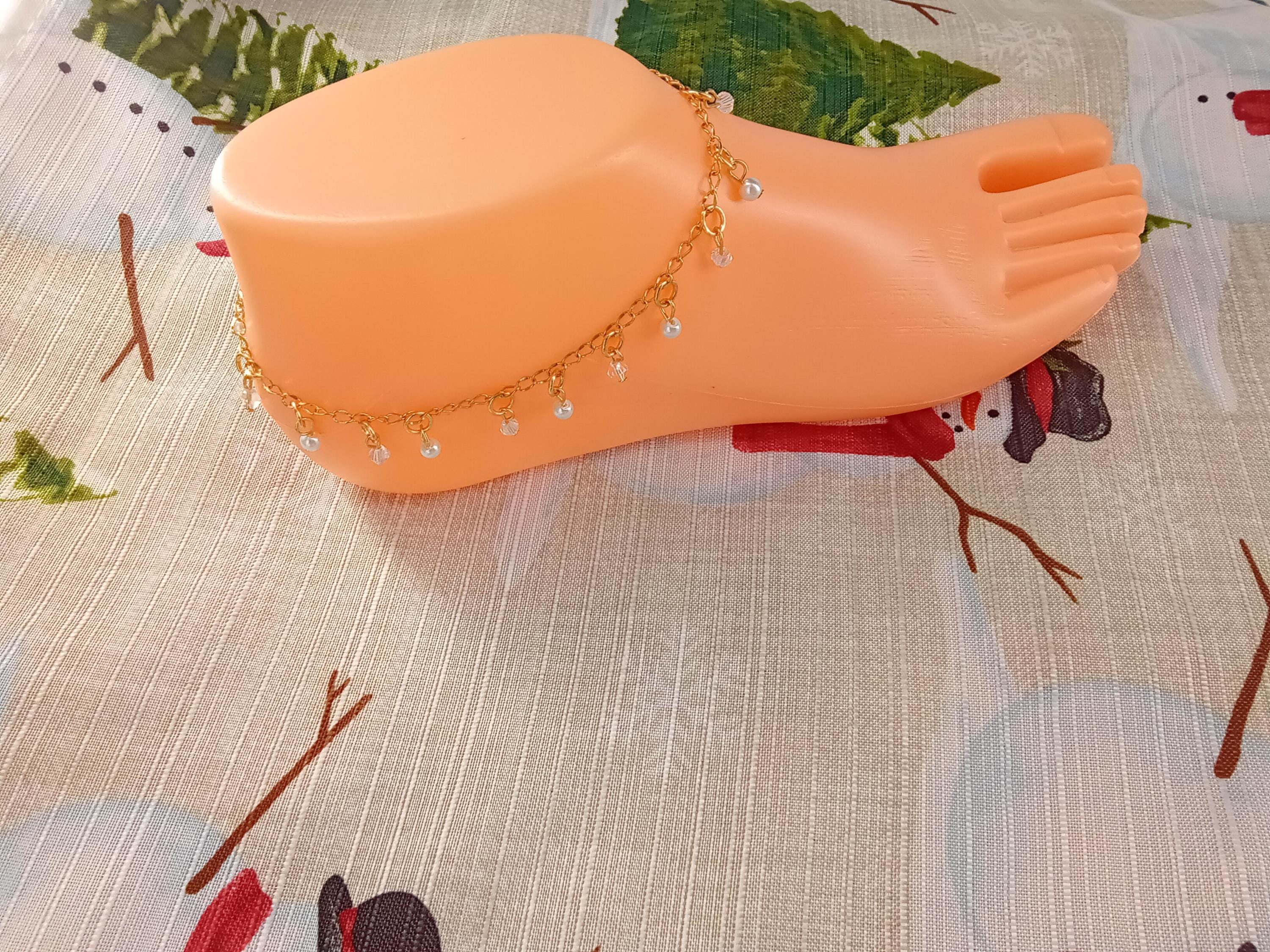 Beautiful Anklet, is stainless steel gold color, The head pins are gold plated 18 kt with white glass pearls 4mm and clear glass bicone, it is around 10.5 inches, with this order you will receive a free stainless steel anklet gold color ( see the picture) If you want something else to watch your Anklets please contact me, Normal response time is between 12-24 hours, Usually you receive the order between 5-7 business days through USPS first-class.