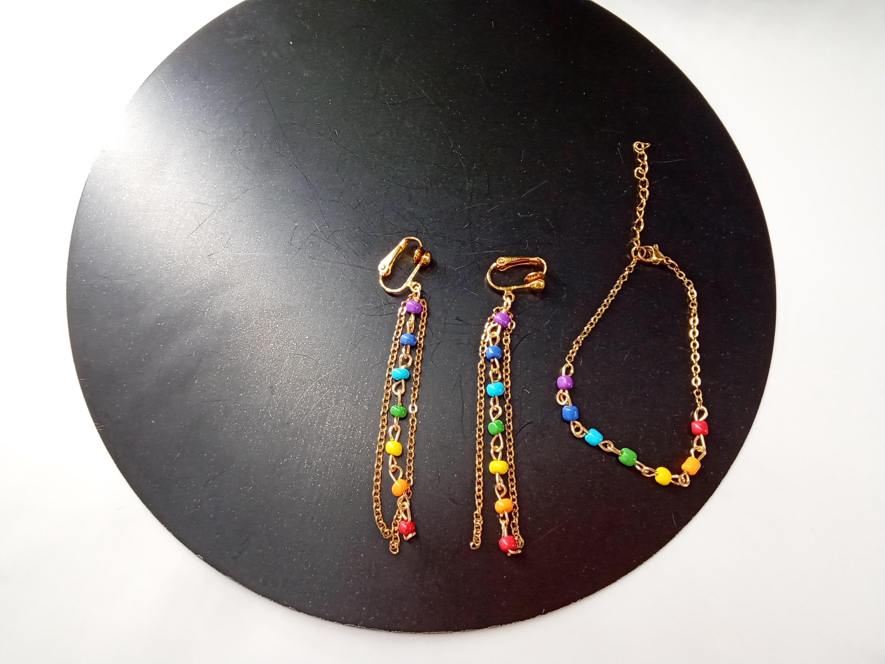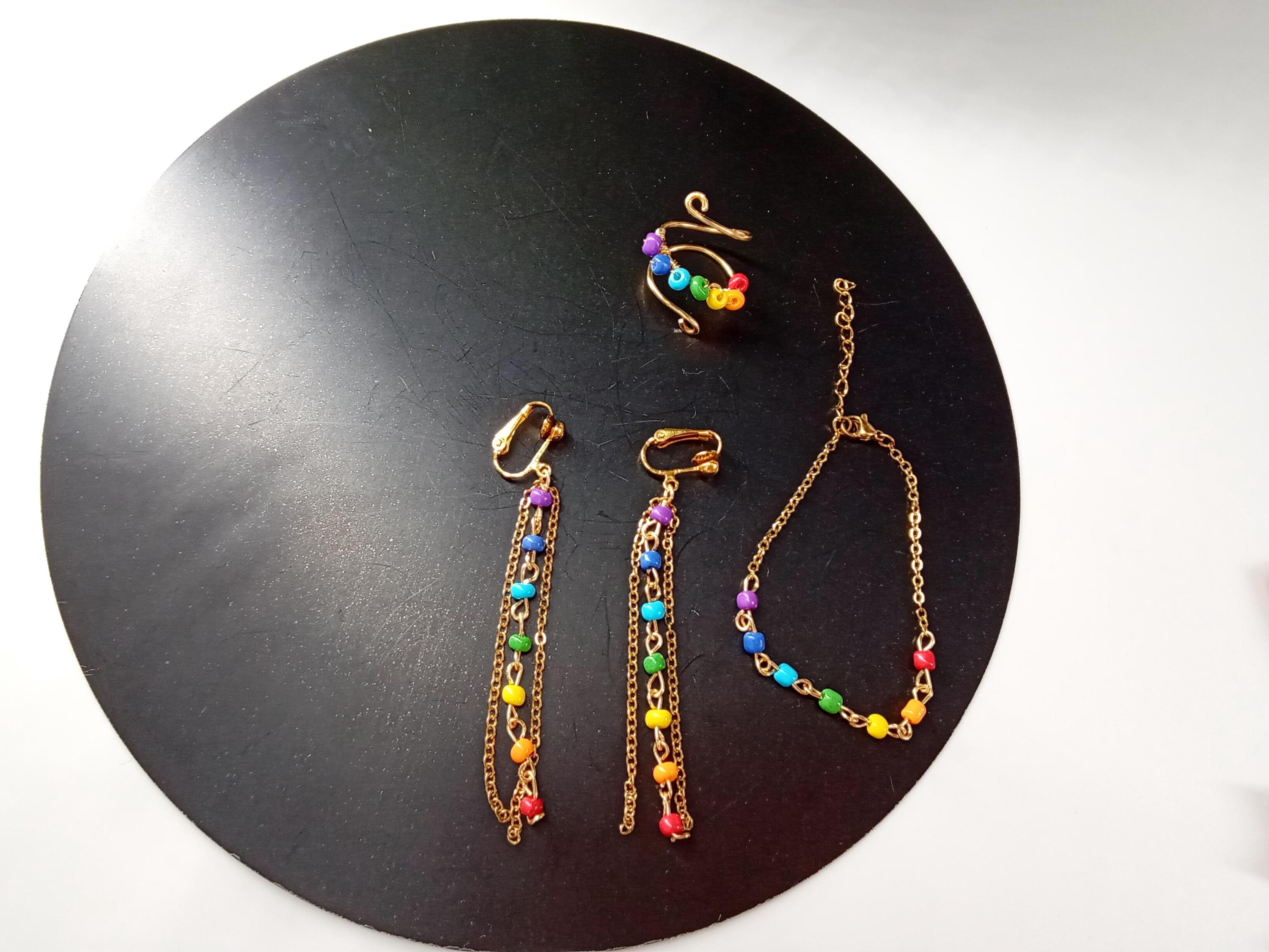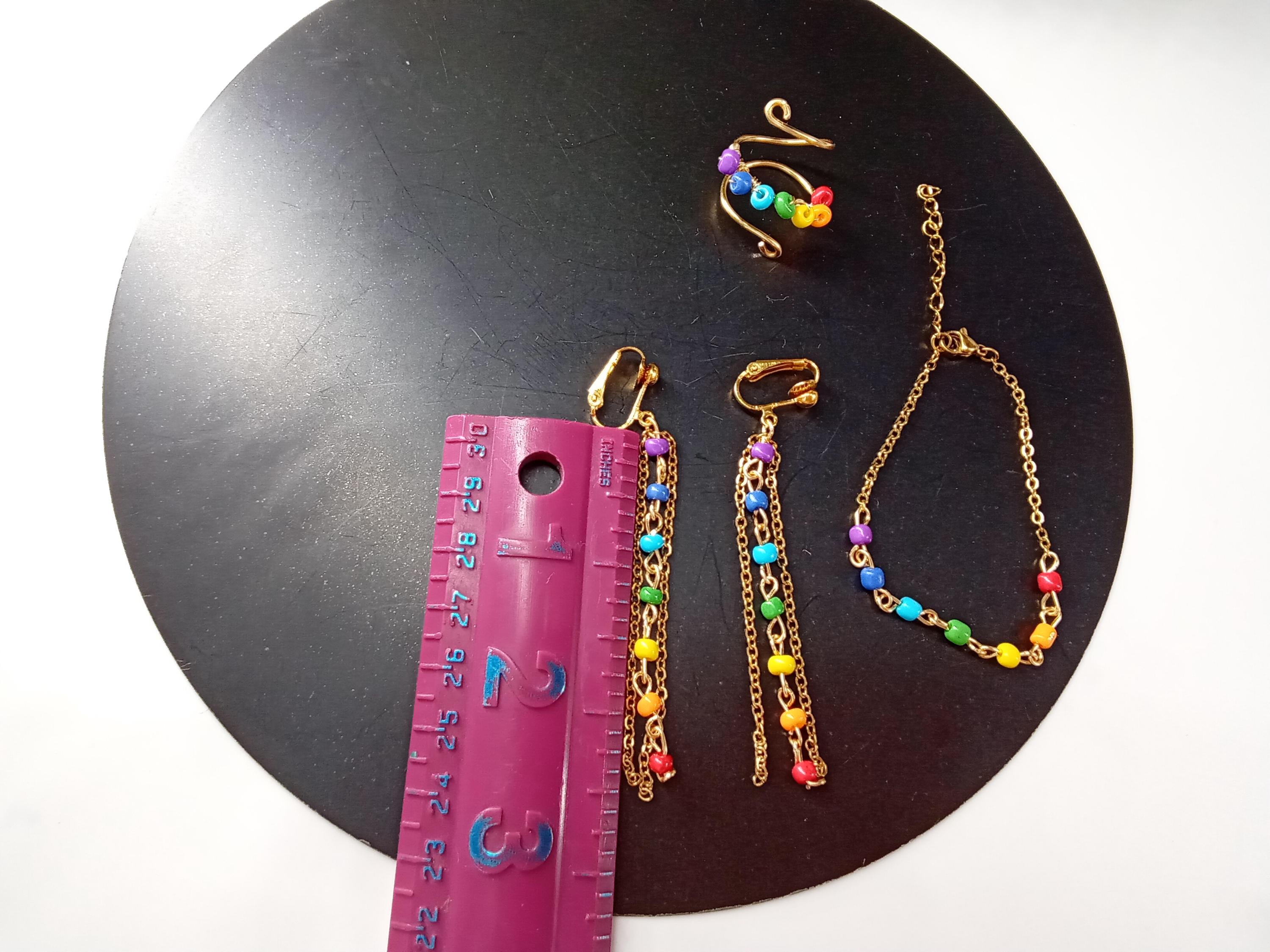 Beautiful chakra colors set, Free Ring, this set include bracelet necklace and earrings, three pieces, with this order you will receive a free ring to match this set, 4 pieces in total, the earrings are around 3. inches long including the ear wire ( clip on wire or regular ear wire, picture on the shop )
