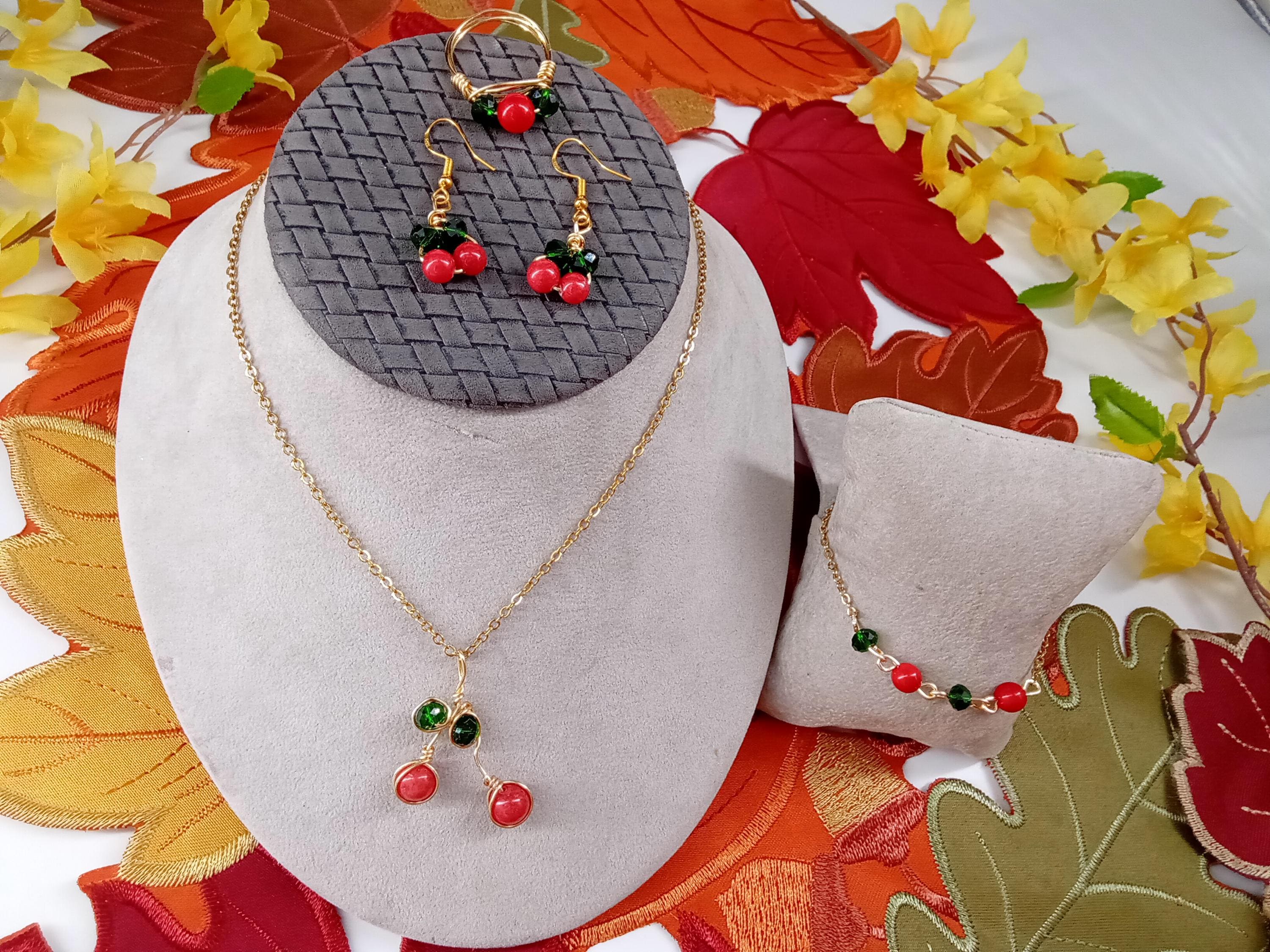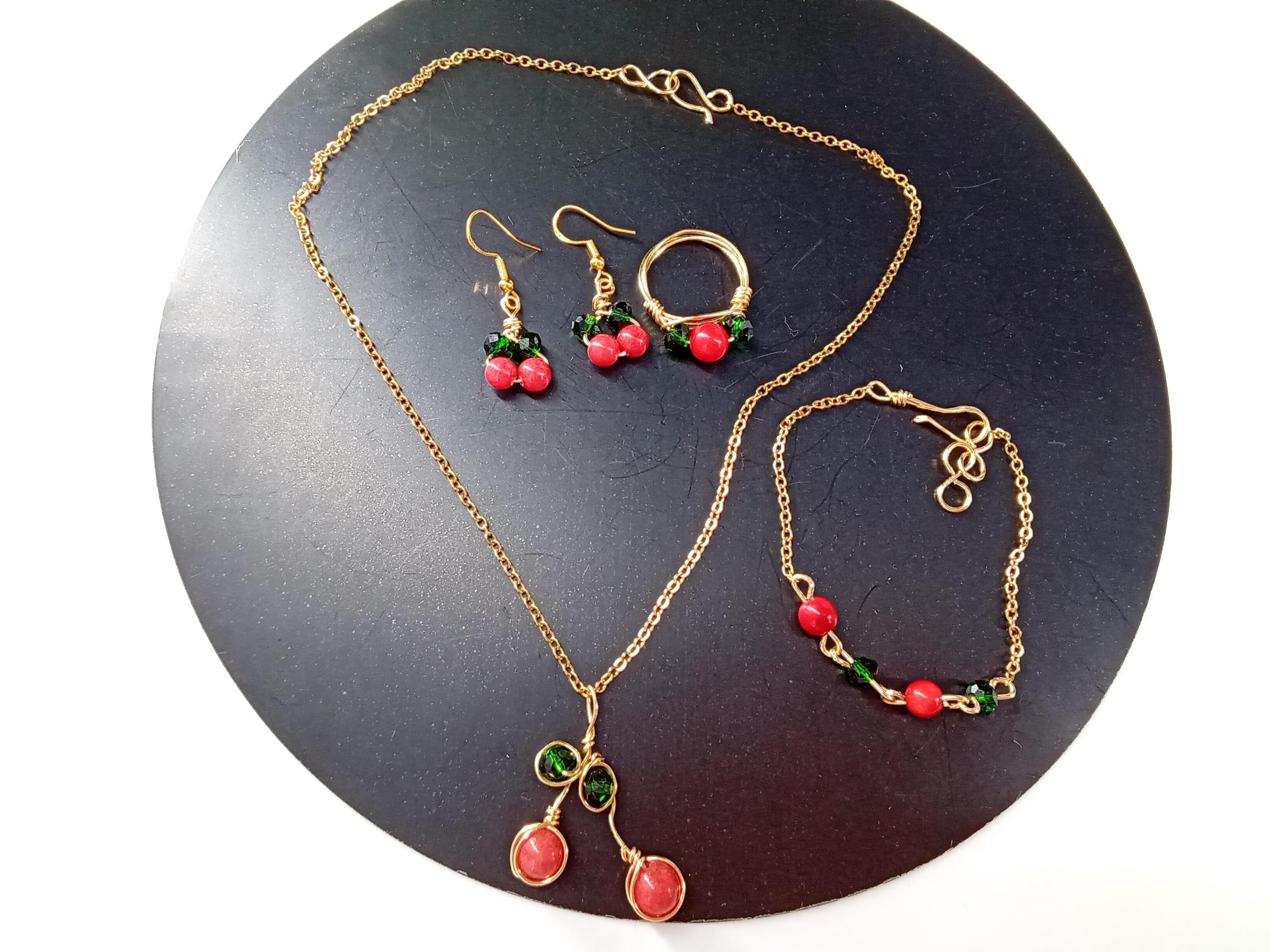 and half inches including the ear wire, different available size of rings, the metal is stainless steel, the clasp and ring wire is are copper wire with gold plated, all the green color beads are 4 mm glass beads, the red color on the bracelet earrings and ring are acrylic 6 mm, the pendant green color beads are 4 mm glass beads, the red color on the pendant is coated jade 8 mm, usually you will receive the order between 5-7 business days through USPS first class.