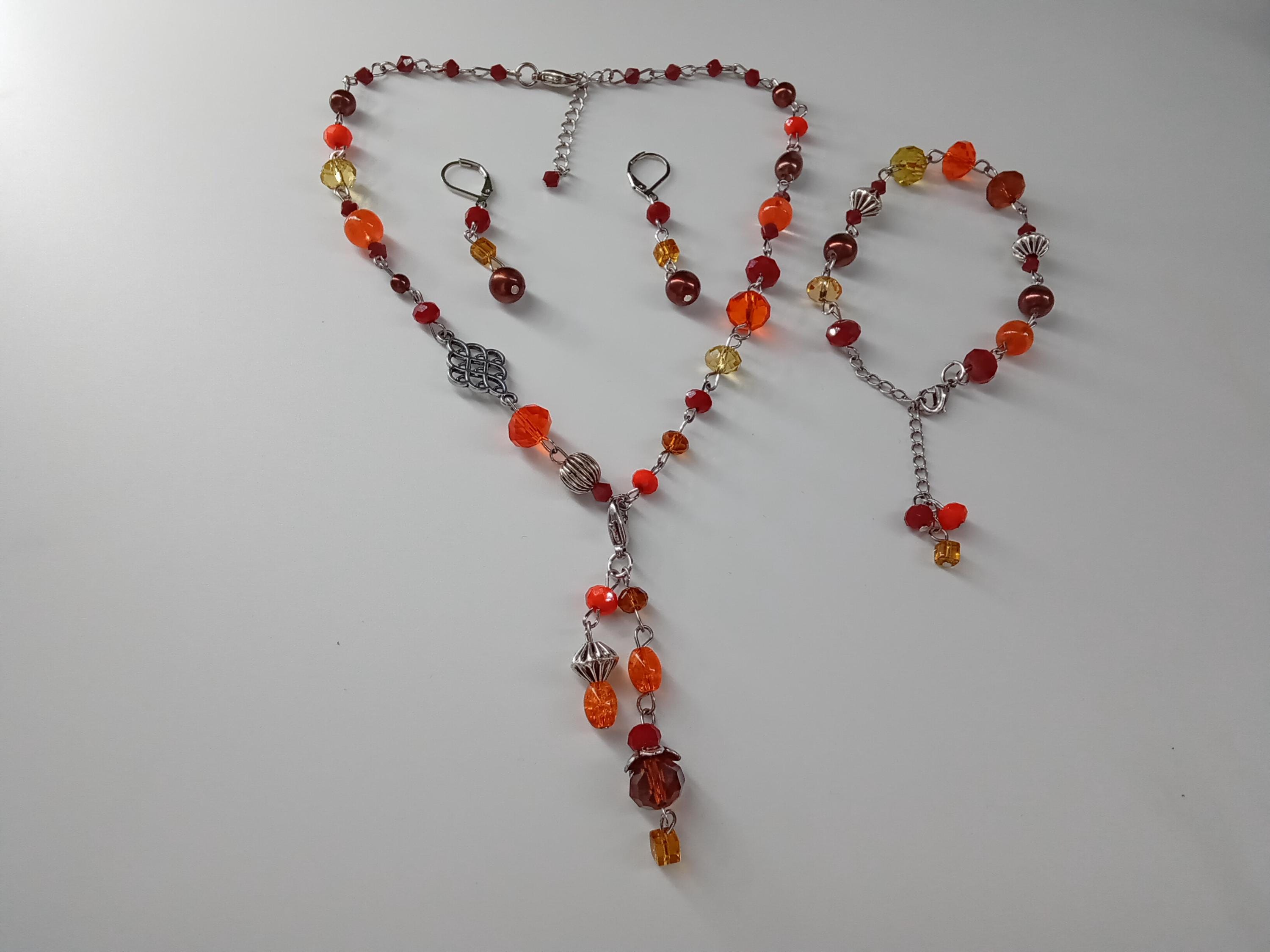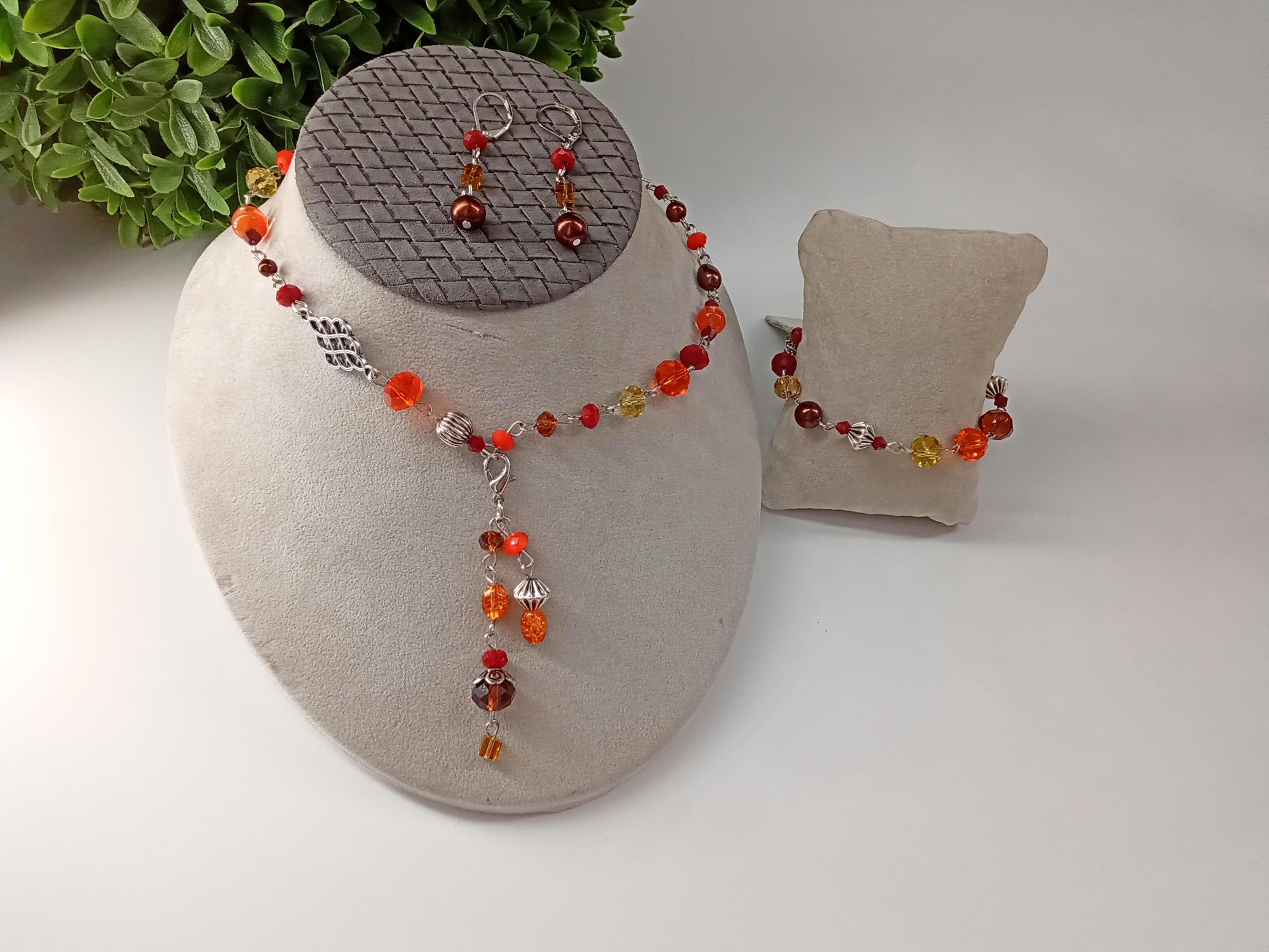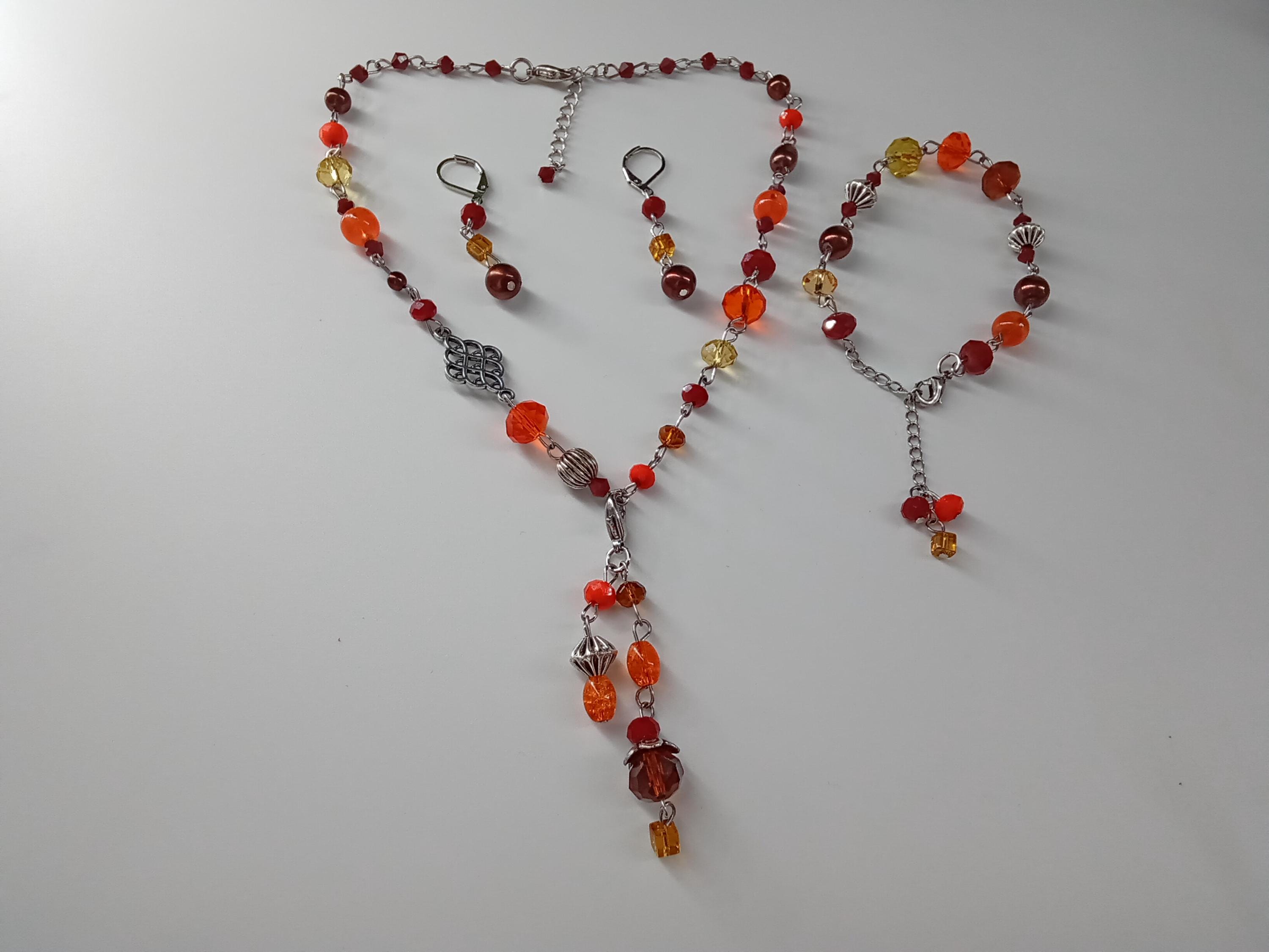 Beautiful set of jewelry, this set include 3 pieces, choker, a bracelet and a pair of earrings, length of the choker is 14 inches and 3 extra inches with the clasp and chain, and has a pendant beads with a clasp, if you prefer to use it without the pendant beads, other occasions you can use it with the pendant, the length of the bracelet is 7 inches and 2 extra inches with a the chain, the earrings long are almost 2 inches including the ear wire,the metal is silver plated, the beads size are from 4mm to 12 mm, If you want other size please contact me, Normal response time: 12-24 hours, You will receive the order between 5-7 business days through USPS first class.