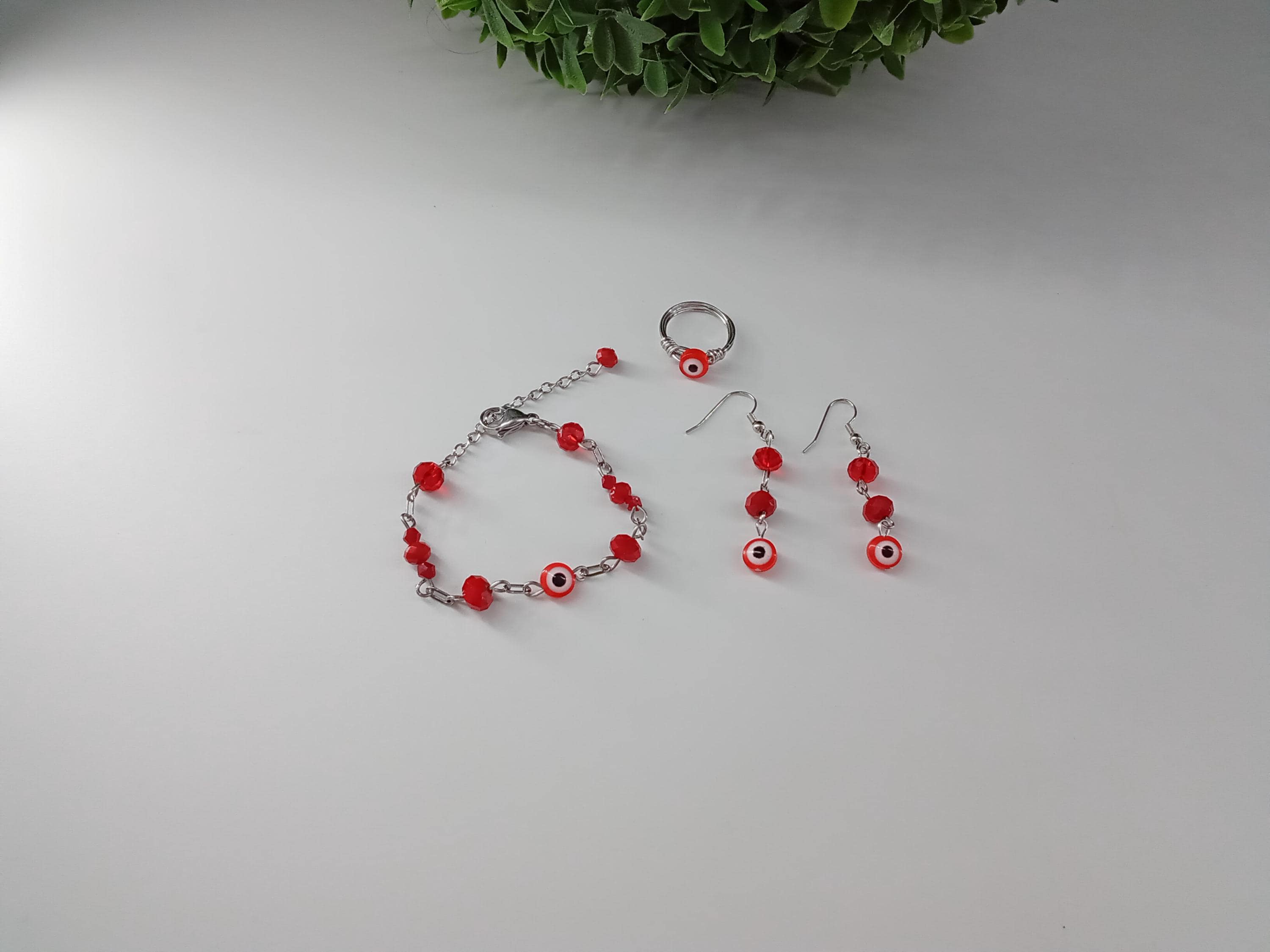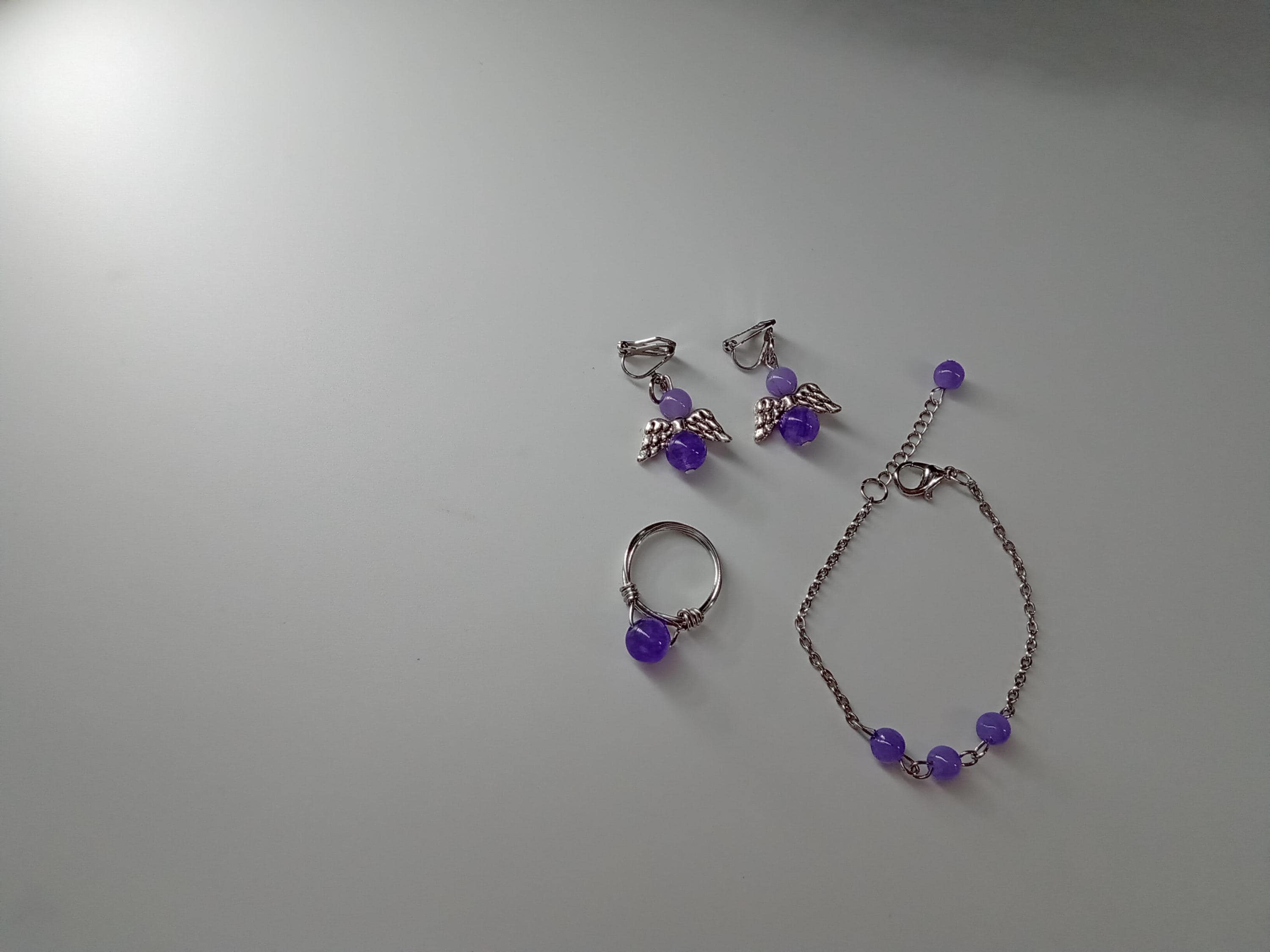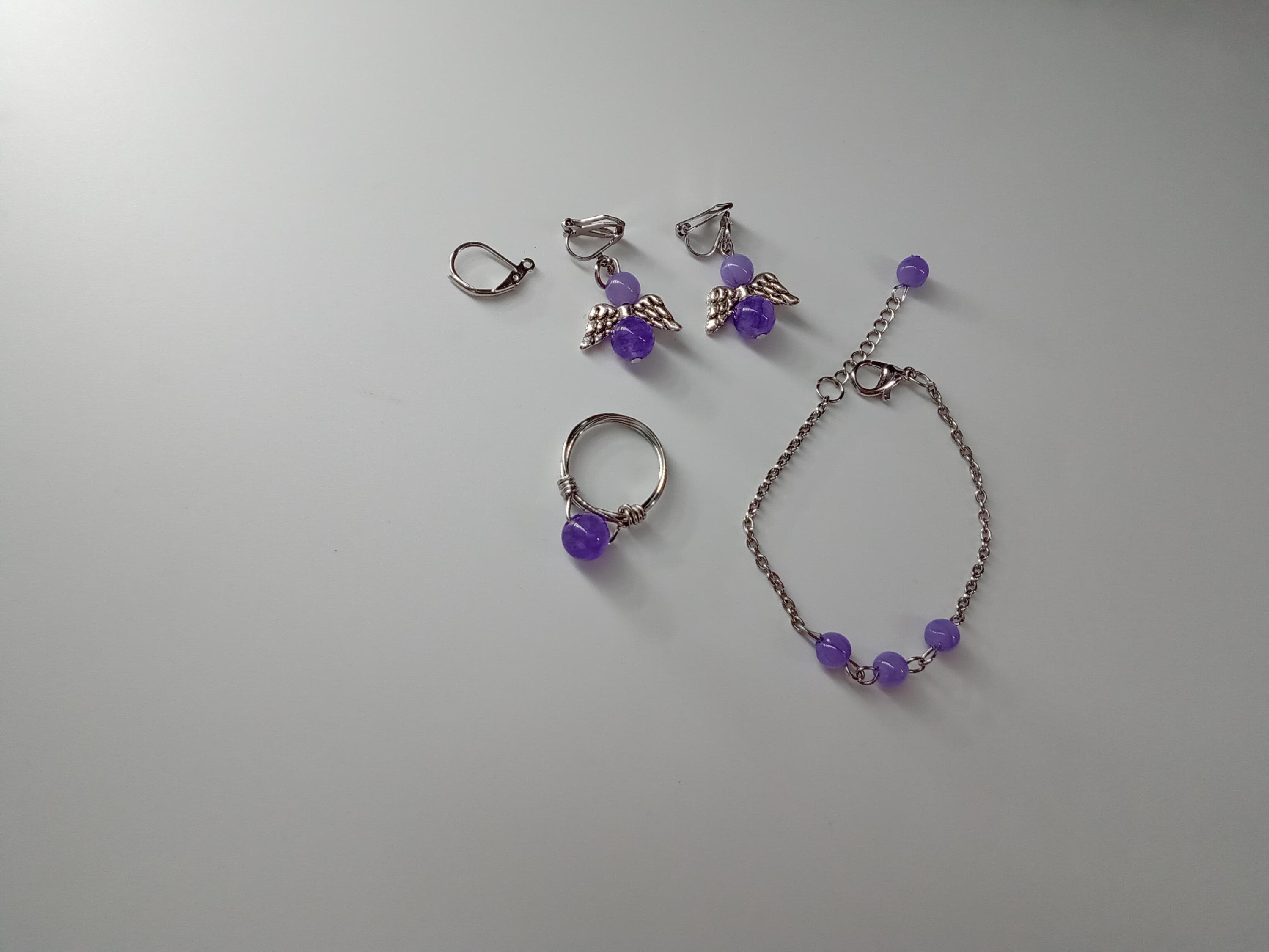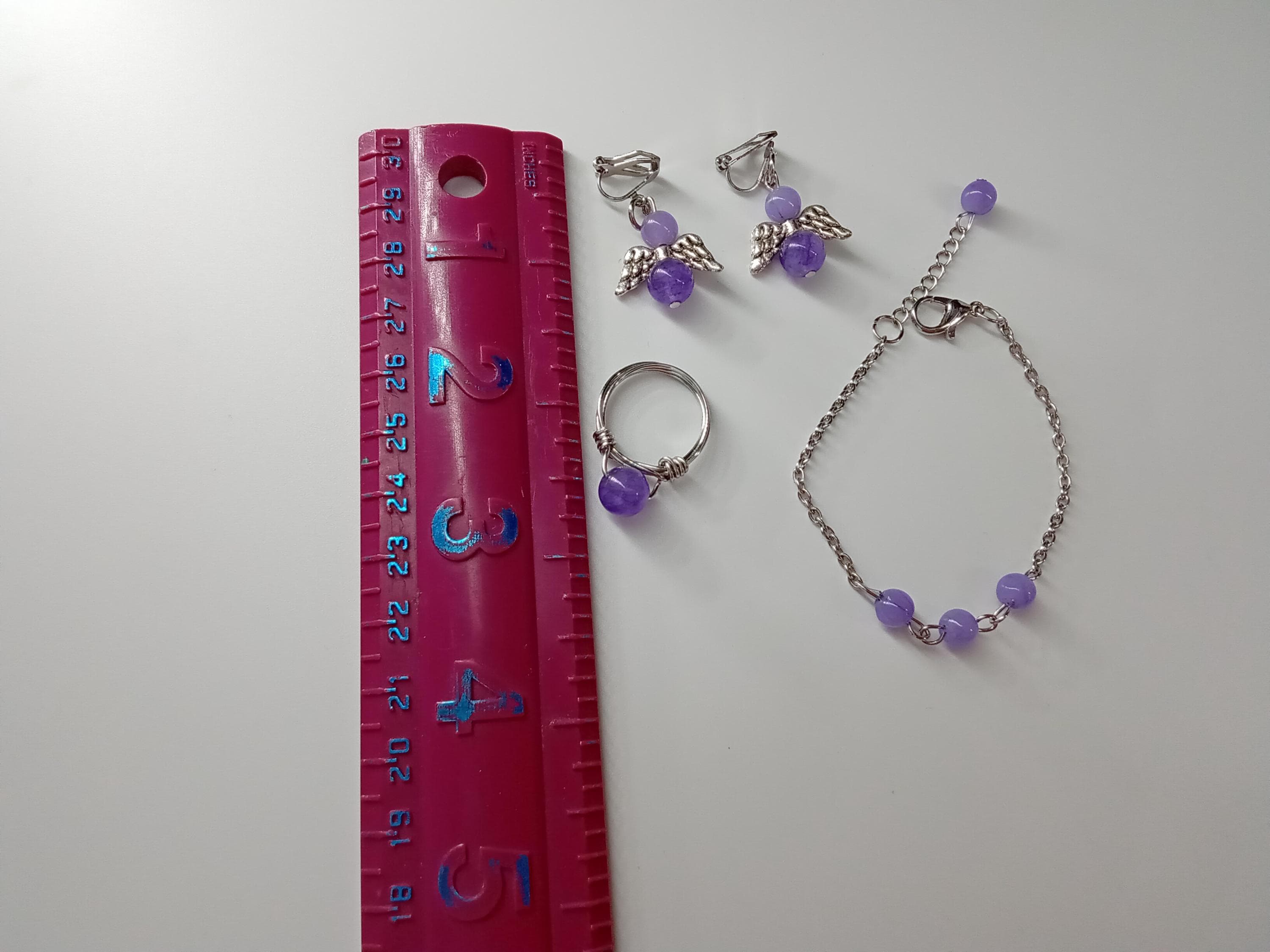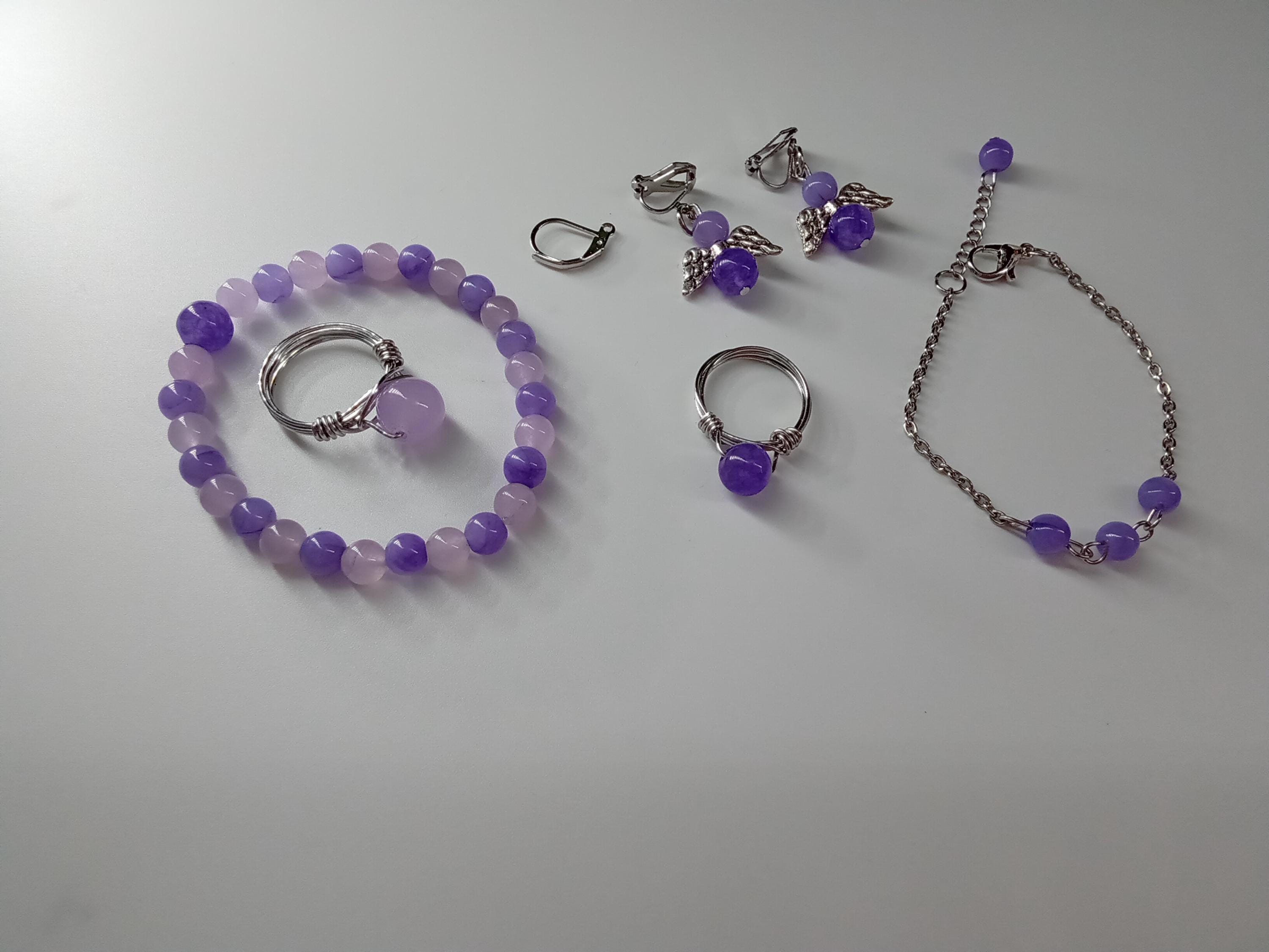 Beautiful set of jewelry of 3 pieces, ( with this order you will receive a 3 pieces set, red eye beads and a free purple beaded phone wrist strap, picture is posted ) it is a great price for all this, this set include the earrings the bracelet and the ring, the rings are not exactly in the size, they are between 5-6 6-7 7-8. 8-9. 9-10 sizes, the stone are Amethyst natural stone, the chain and all metal is silver plated color, the bracelet size is 6 to the inches and 1 inch chain, in total is 7 inches, the earrings are around 1 inch including the ear wire, clip on wire available and the the regular ear wire, the style is posted on one of my pictures, the size of the beads are 6 mm 8 mm and 10 mm,if you want stretch bracelet, other stone like natural stone Quartz or if you want sterling silver chain and metal, please contact me Normal response time 12-24 hours, You will receive the order between 5-7 business days through USPS first class.
