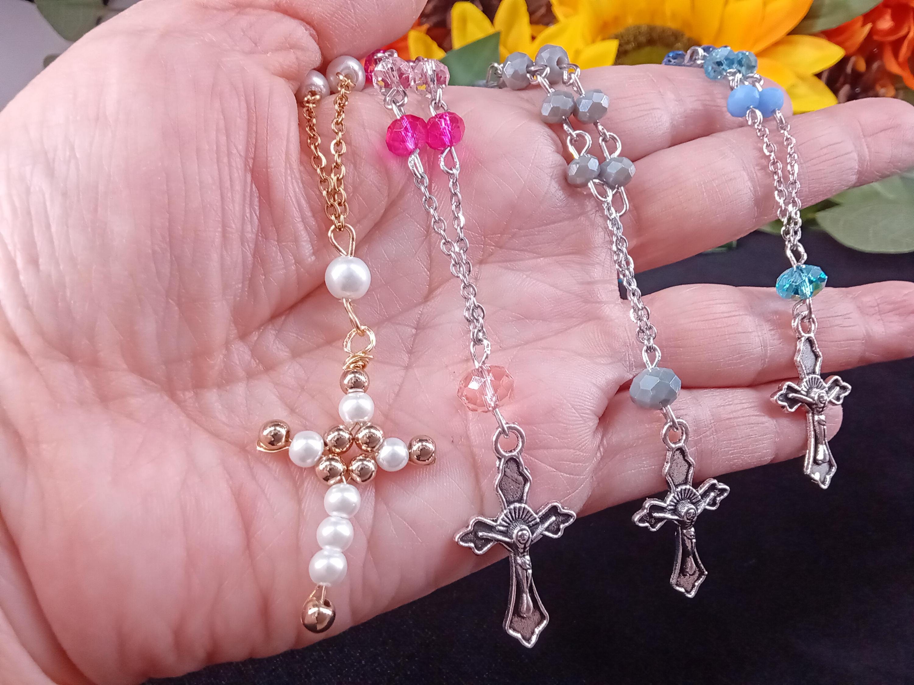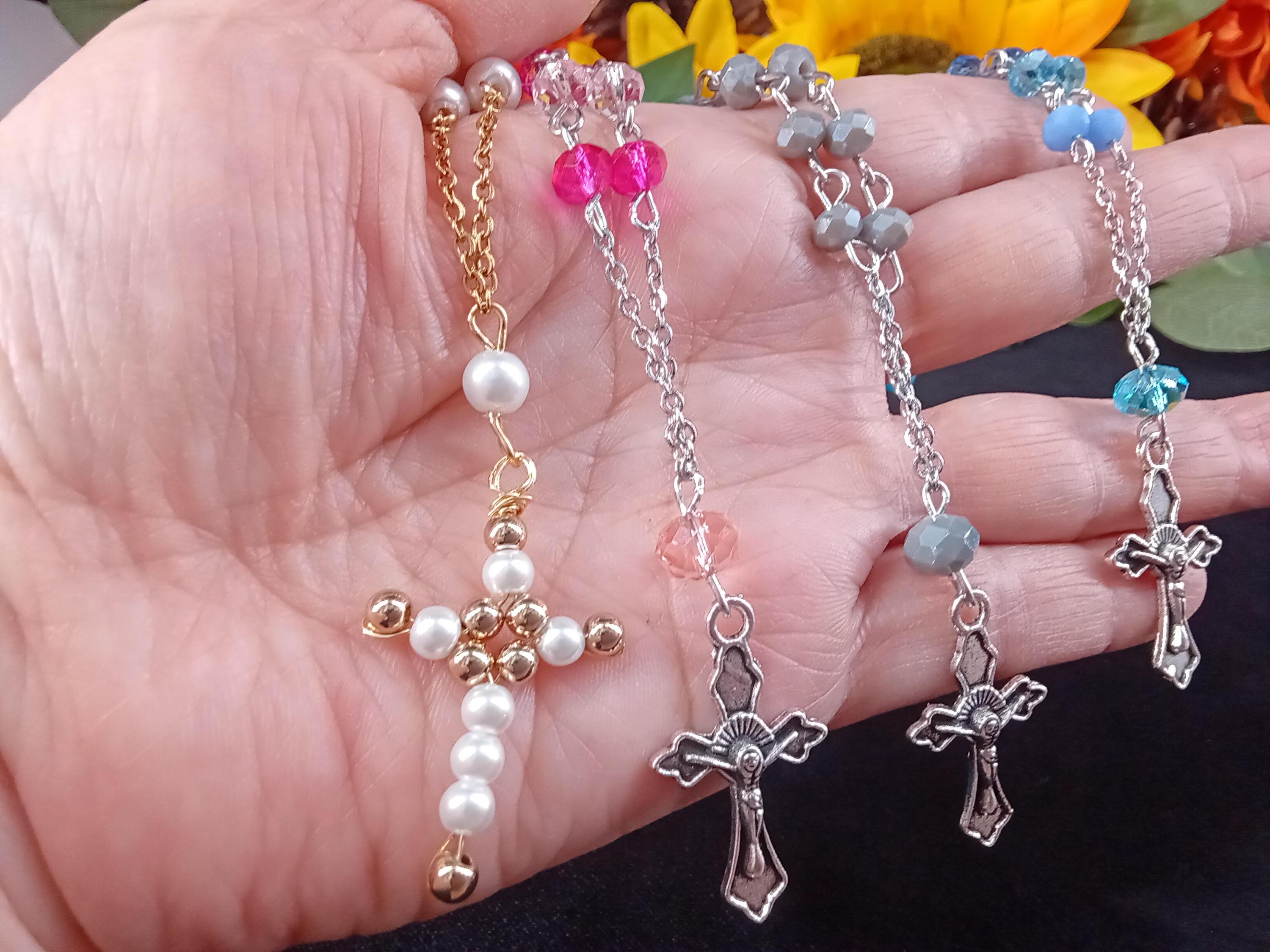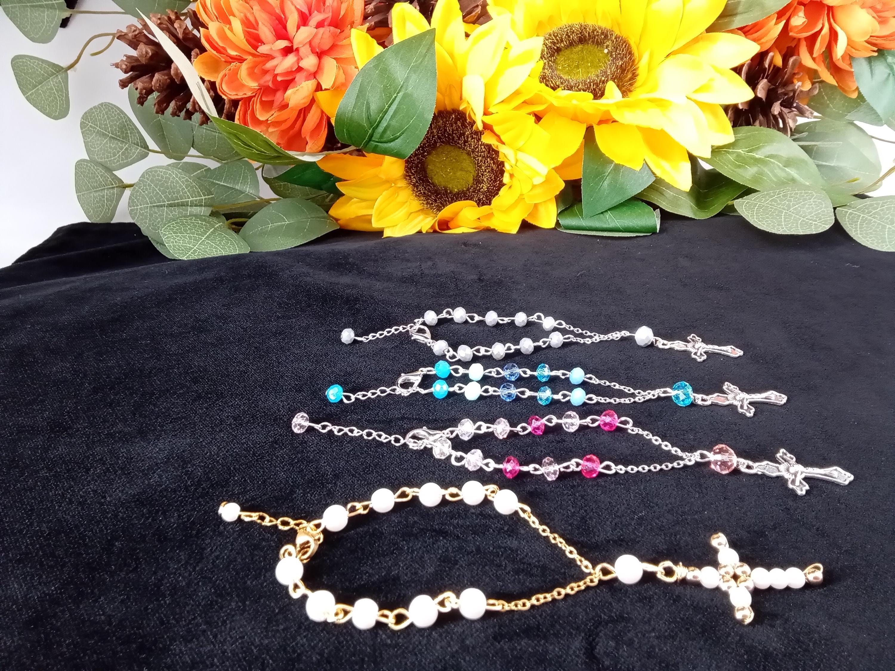 Beautiful ser of three bracelets, blue, gray and pink, you will receive one free Pearl rosary bracelet with this order, it is a great present to a special person, size of beads: 6 mm length bracelet is 6 and half inches with 1 and half inches of chain, material: wire silver plated and glass beads, please send mean e-mail if you want something else to match these bracelets, normal response time 12-24 hours, usually you will receive the order between 5-7 business days through USPS first class